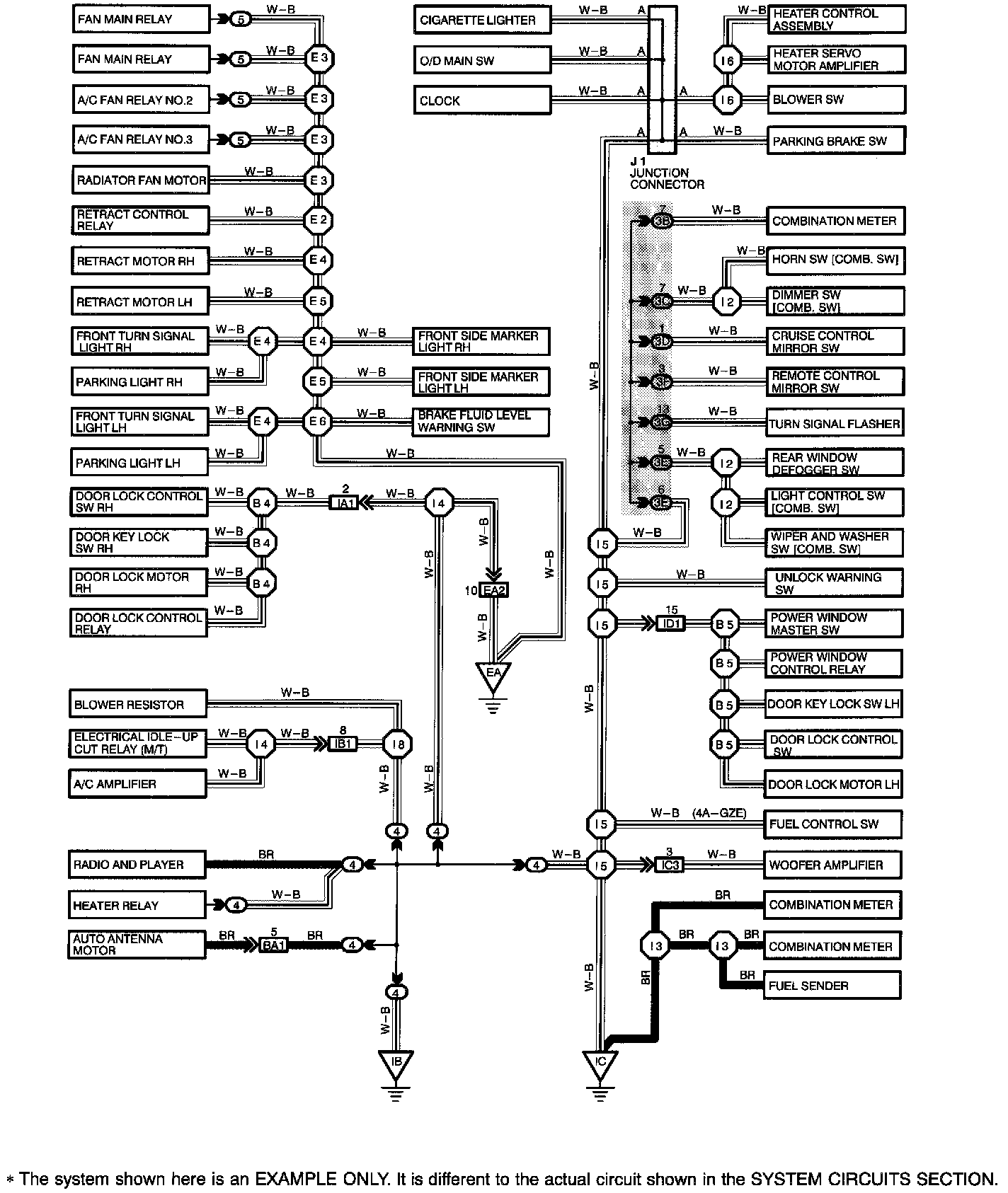 The ground points circuit diagram shows the connections from all major parts to the respective ground points. When troubleshooting a faulty ground point, checking the system circuits which use a common ground may help you identify the problem ground quickly. The relationship between ground points (EA, IB and IC shown below) can also be checked this way.