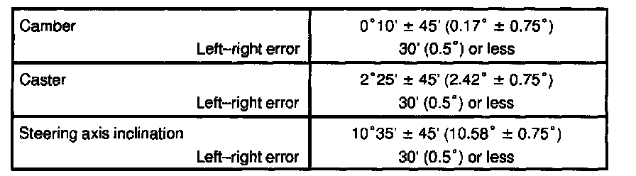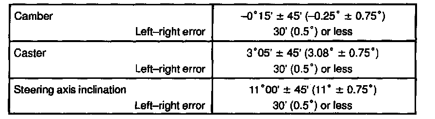 If the steering axis inclination is not within the specification, after the camber and caster have correctly adjusted, recheck the steering knuckle and front wheel bearing for looseness.