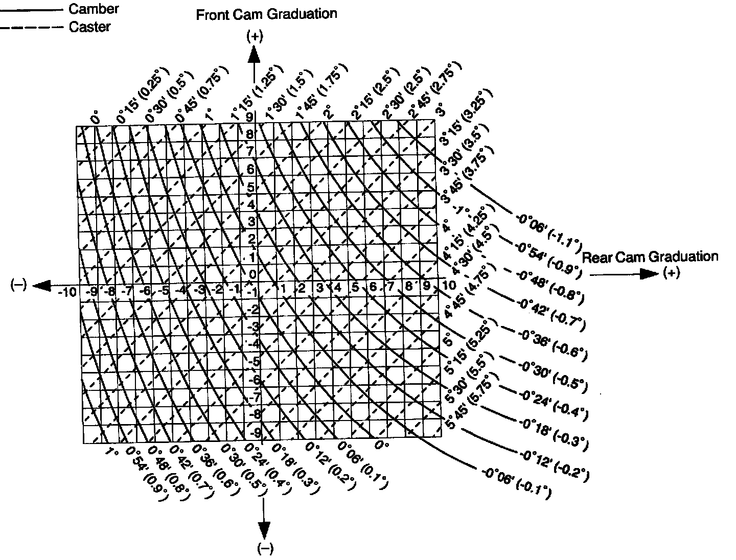 b. Adjust the camber and caster by front and/or rear adjusting cams. (See adjustment chart)