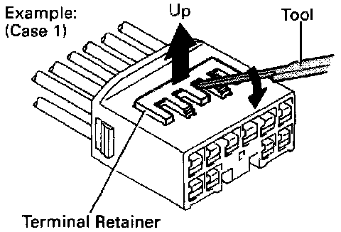 Insert the special tool into the terminal retainer access hole (Mark) and pull the terminal retainer up to the temporary lock position.
