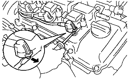 1. Using a screwdriver, lift up the lock claw and disconnect the holder from the ignition coils.