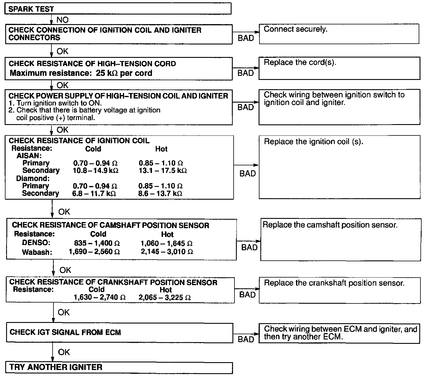 NOTE: "Cold" and "Hot" in these sentences express the temperature of the coils themselves. "Cold" is from -10°C (14°F) to 50°C (122°F) and "Hot" is from 50°C (122°F) to 100°C (212°F).INSPECT IGNITER SPARK TEST