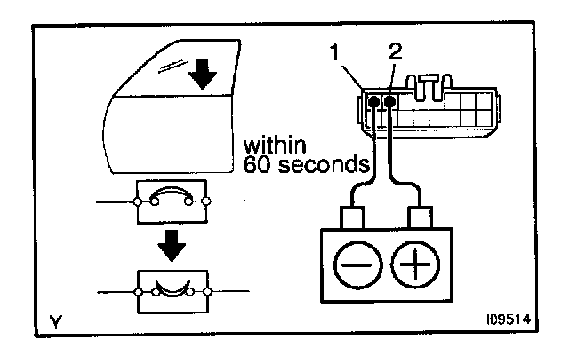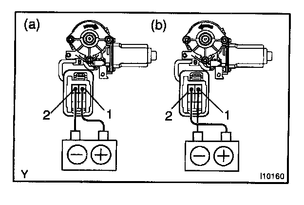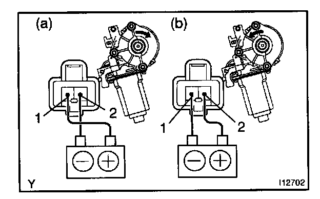 b. Connect the positive (+) lead from the battery to terminal 1 and the negative (-) lead to terminal 2 on the wire harness side connector and raise the window to full closed position.