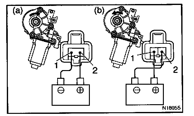 a. Connect the positive (+) lead from the battery to terminal 1 and the negative (-) lead to terminal 2, and check that the motor turns clockwise.