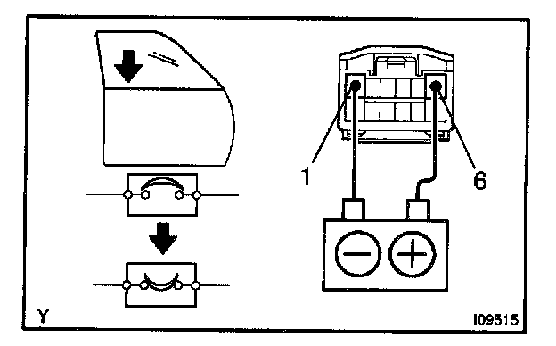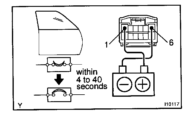 b. Connect the positive (+) lead from the battery to terminal 6 and the negative (-) lead to terminal 1 on the wire harness side connector, and raise the window to full closed position.