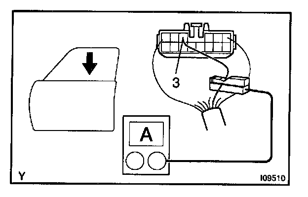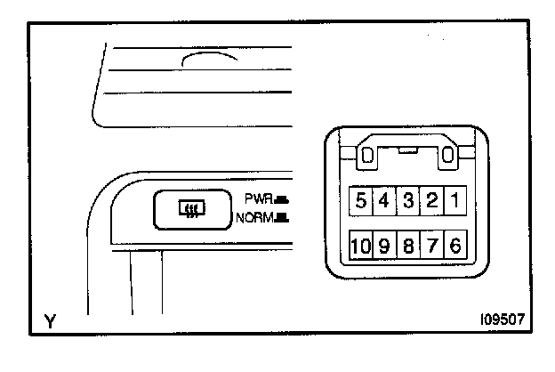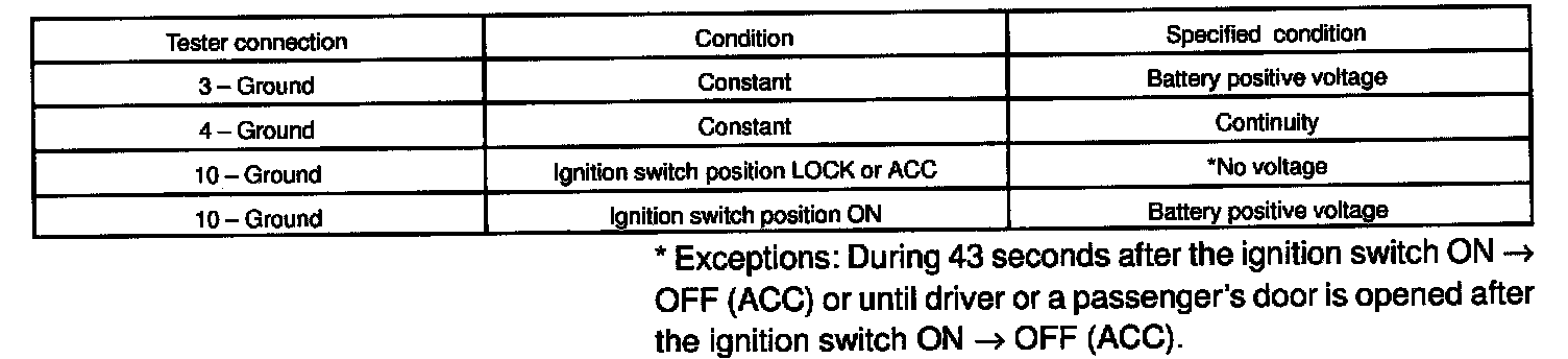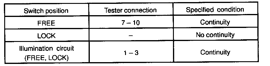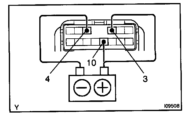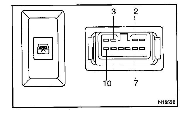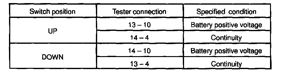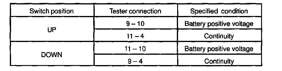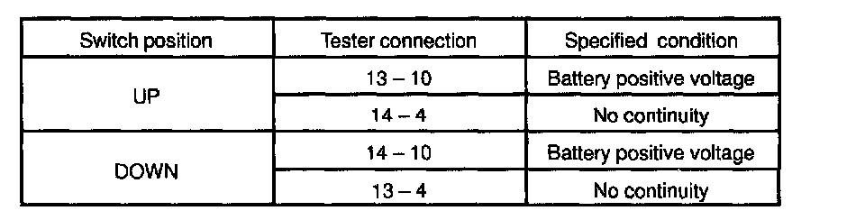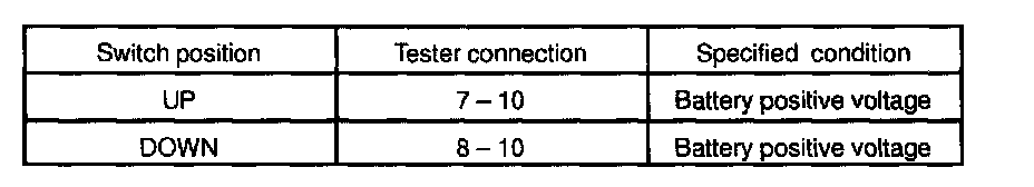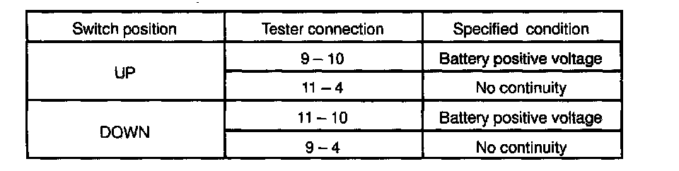 INSPECT POWER WINDOW MASTER SWITCH CONTINUITYConnect the positive (+) lead from the battery to terminals 3 and 10 and the negative (-) lead to terminal 4.