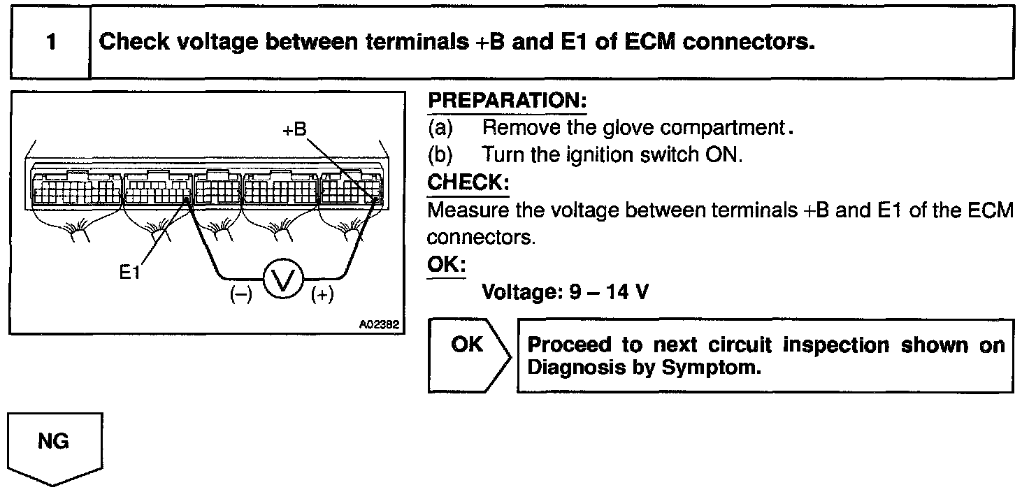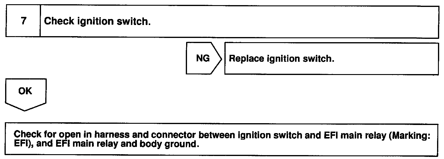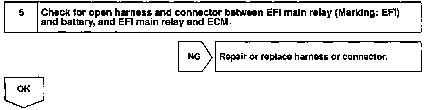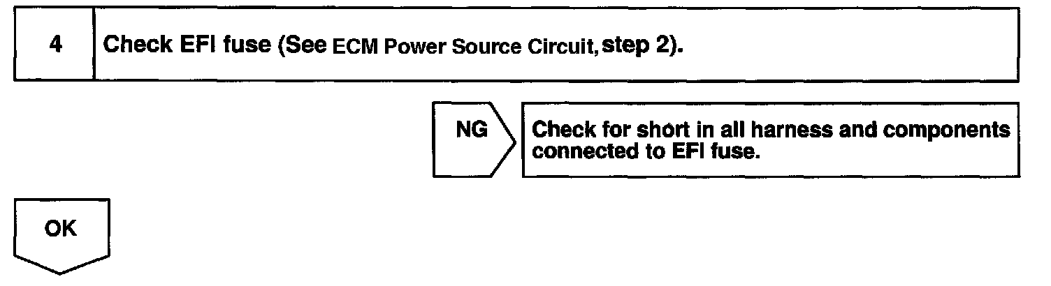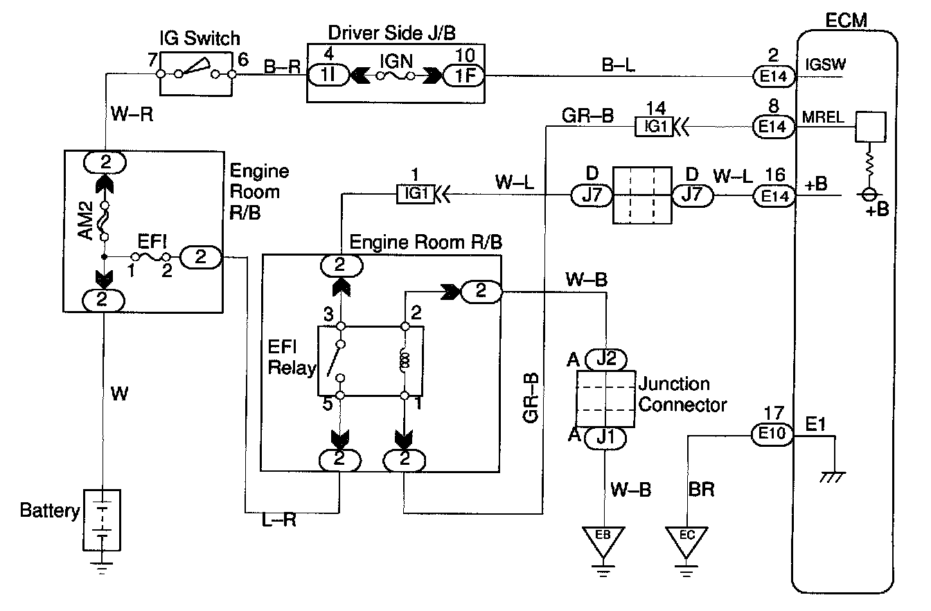 CIRCUIT DESCRIPTIONWhen the ignition switch is turned ON, battery positive voltage is applied to the coil, closing the contacts of the EFI main relay (Marking; EFI) and supplying power to terminal +B of the ECM.
