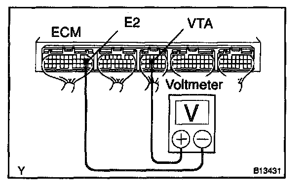 If you have no TOYOTA hand-held tester, measure voltage between terminals VTA and E2 of the ECM connector.