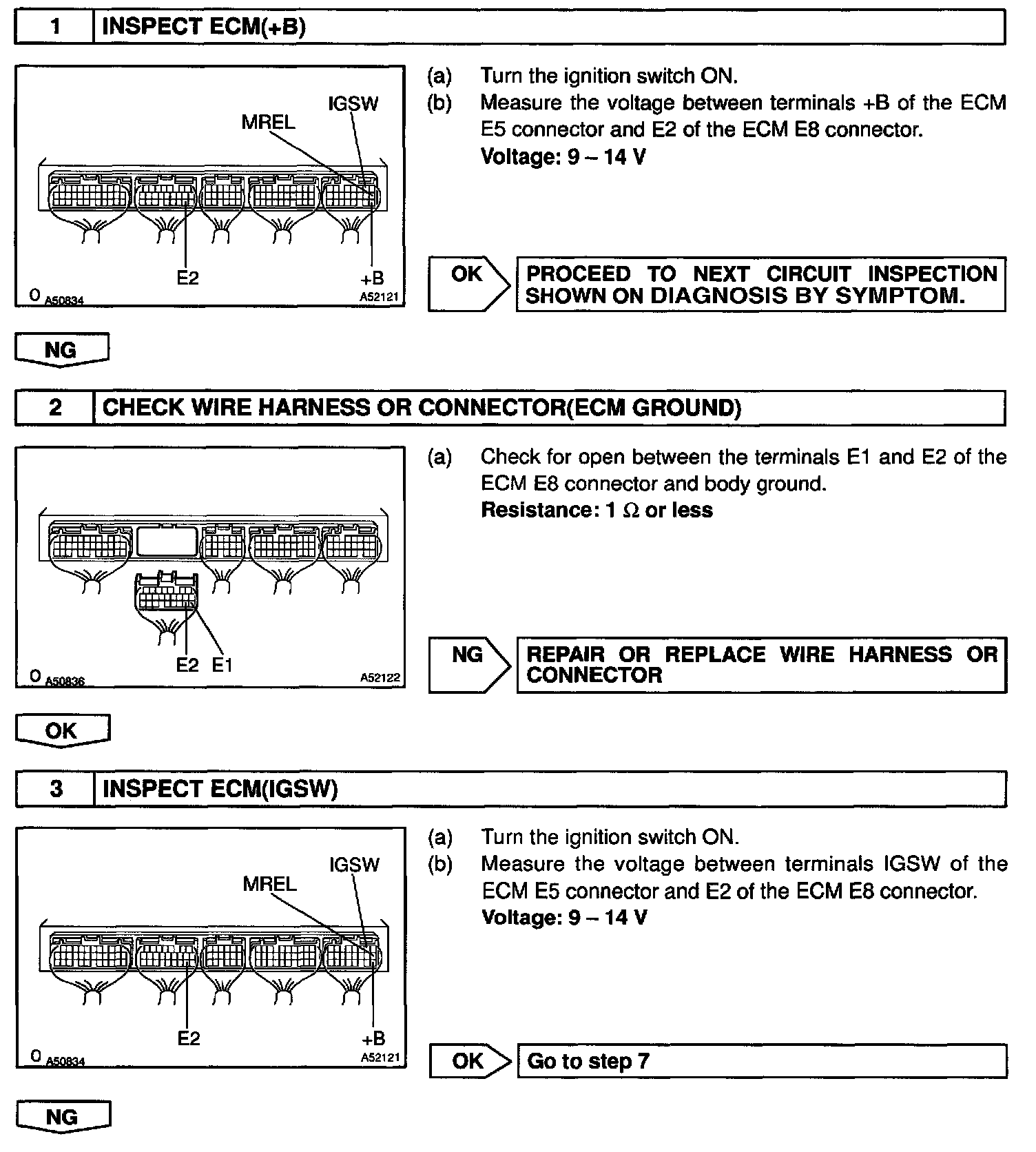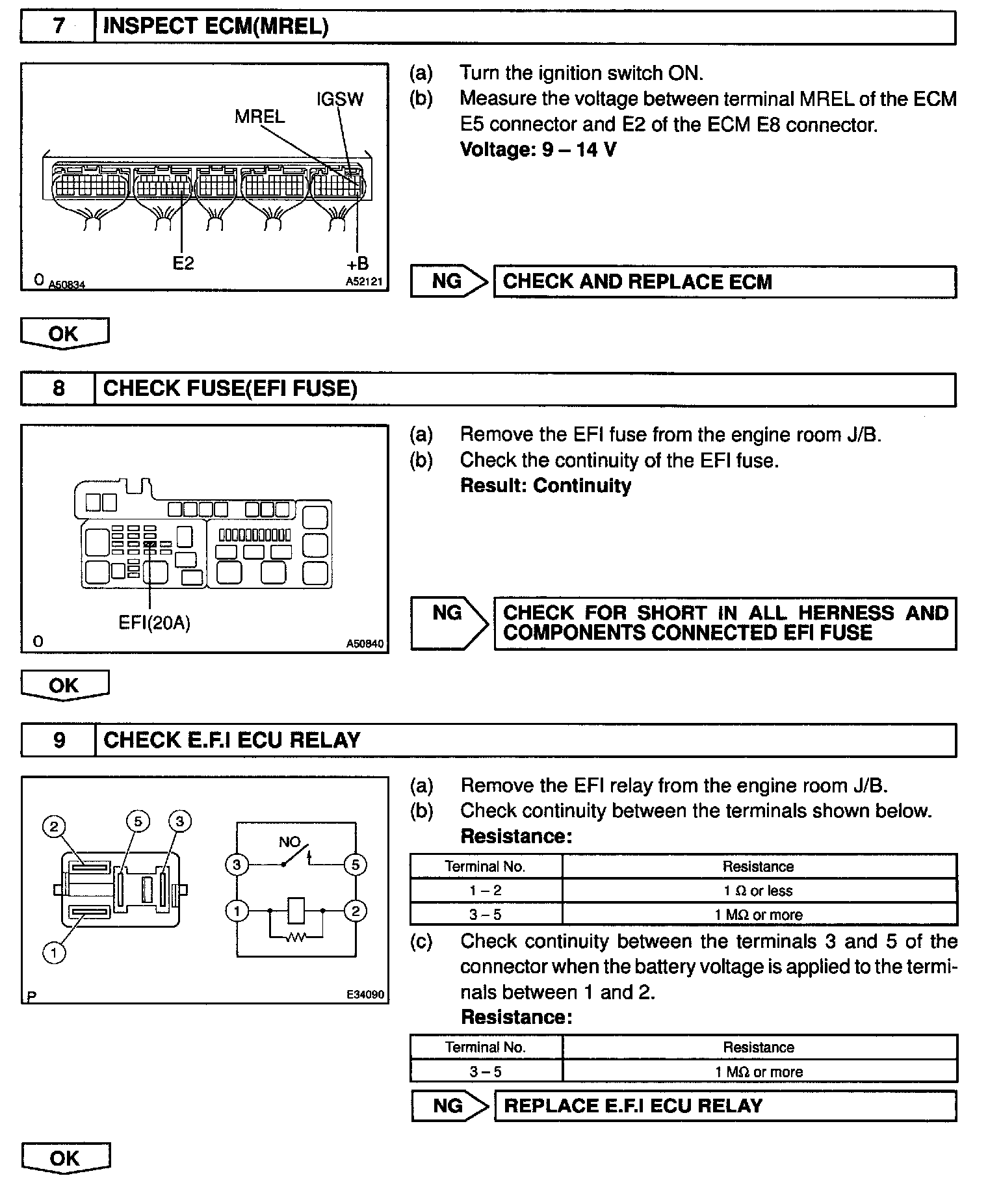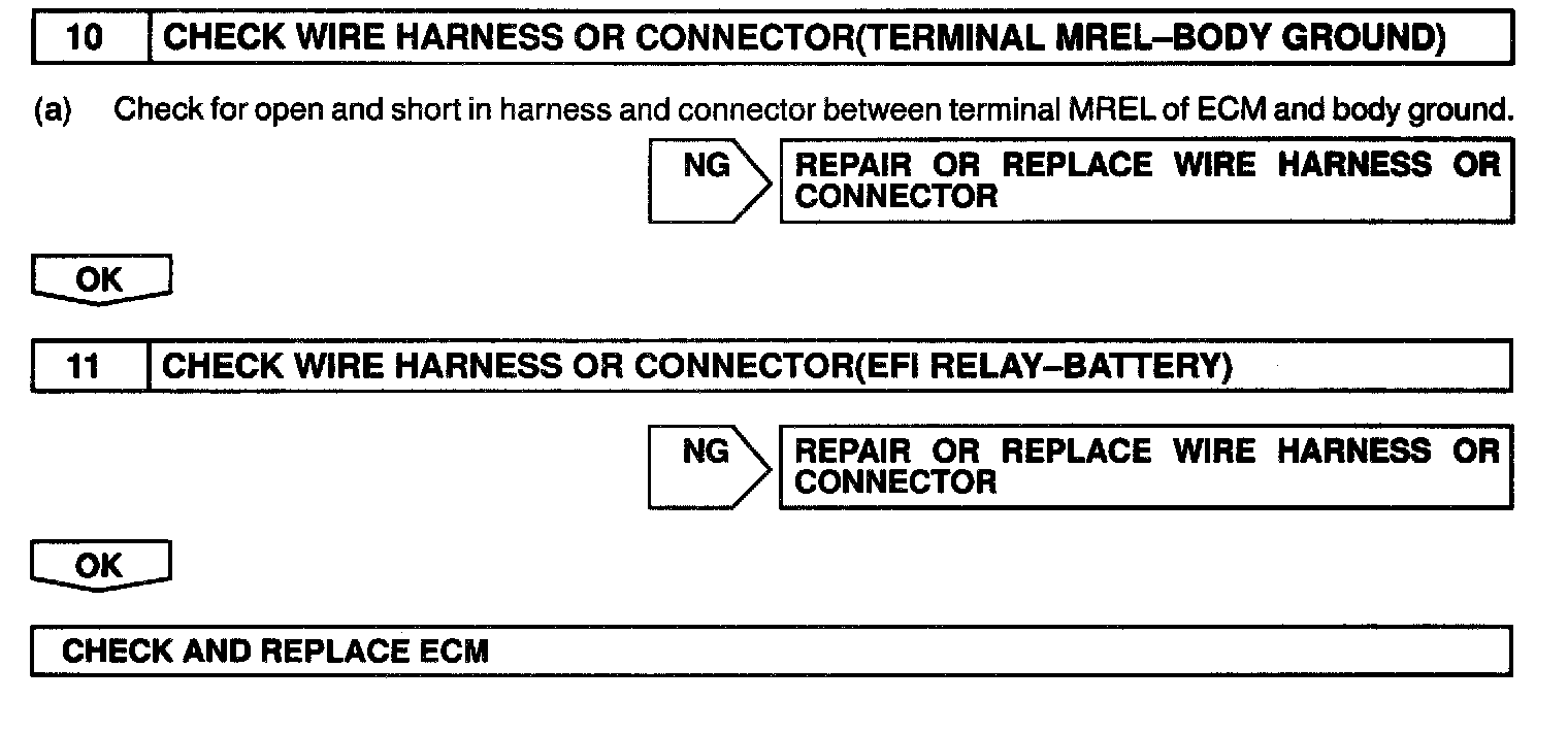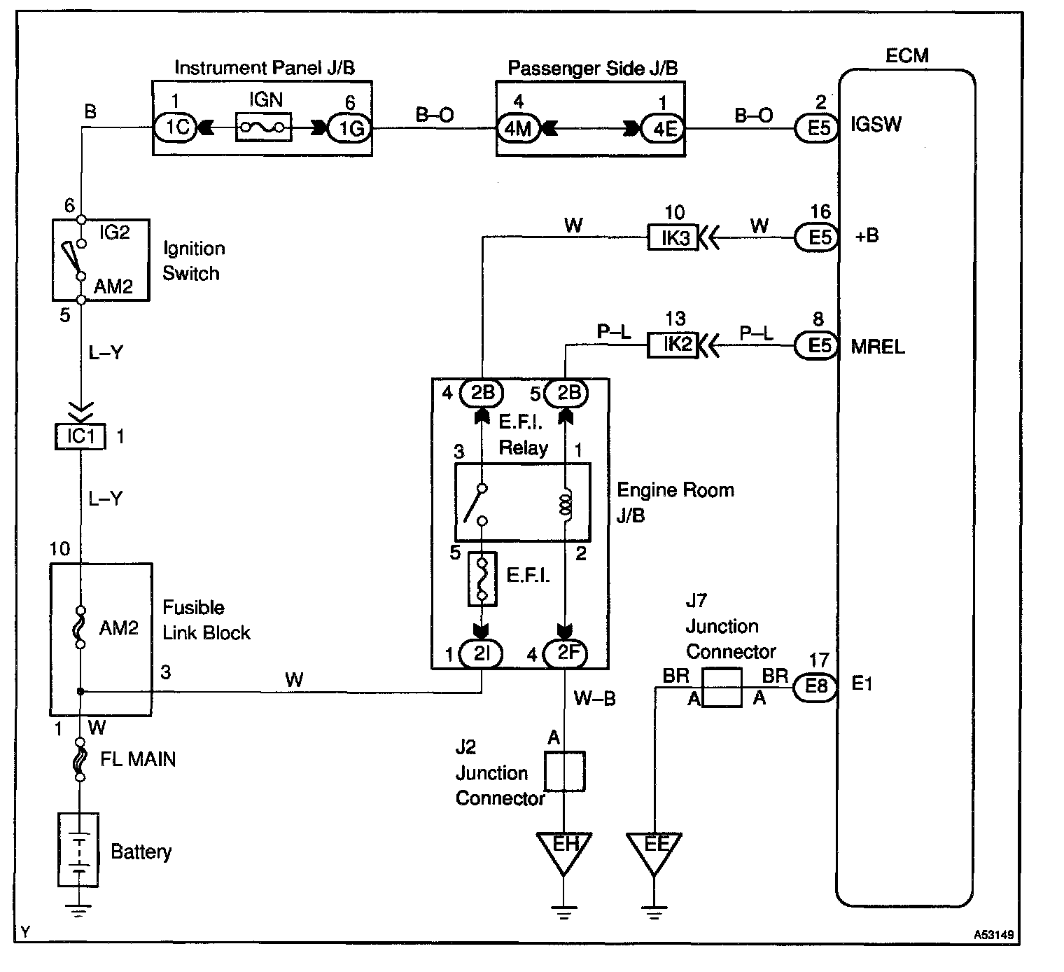 When the ignition switch is turned on, battery positive voltage is applied to 1G2 Relay, terminal IGSW of the ECM and the EFI main relay control circuit in the ECM sends a signal to terminal MREL of the ECM by switching on the EFI main relay.