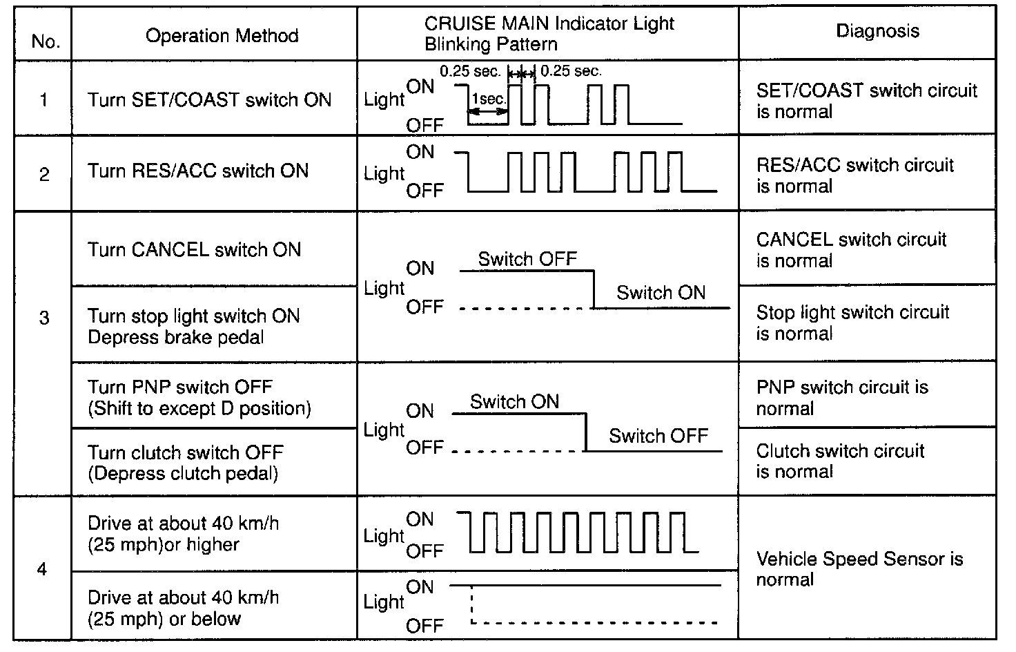 f. Read the blinking pattern of the CRUISE MAIN indicator light.