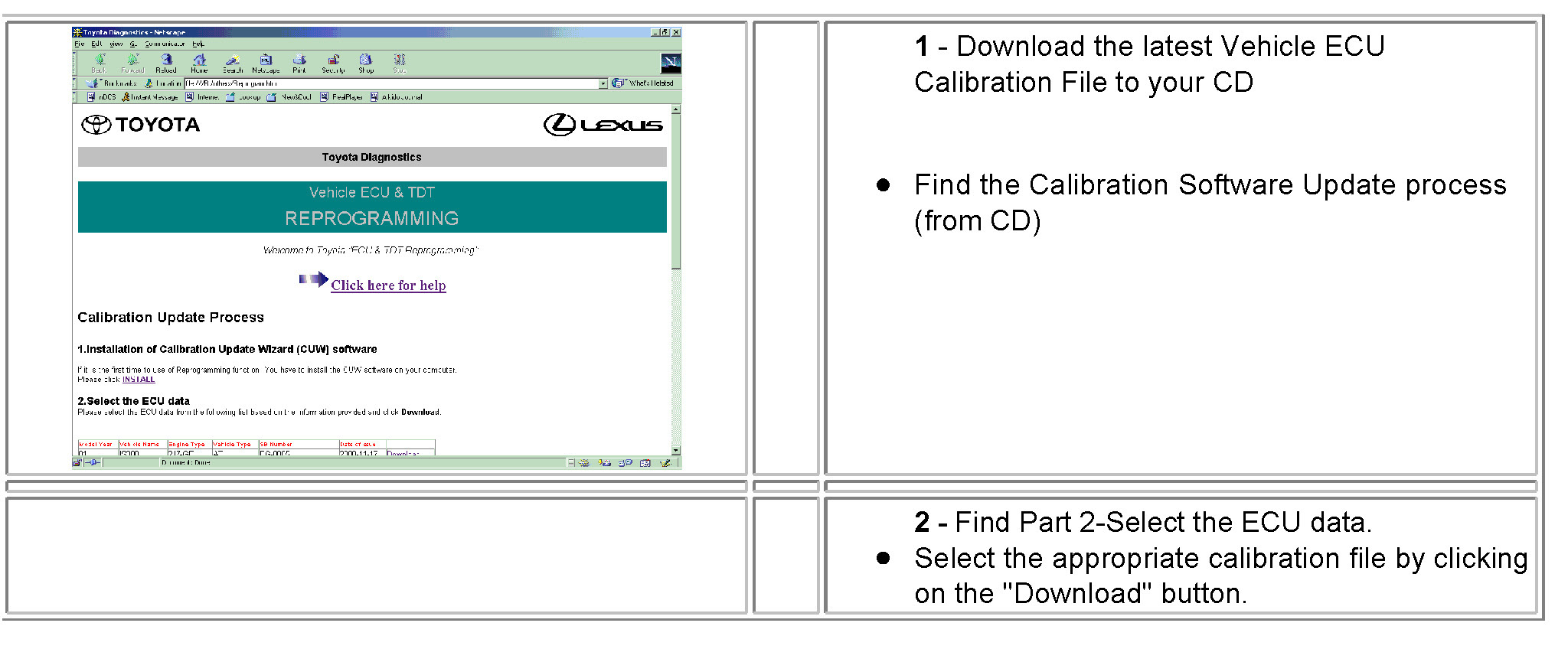 Flash Calibration updates for specific models/ECU will be released as field fix procedures described in individual service bulletins. This bulletin details the ECU flash reprogramming process, the applications within the CD provided and the Toyota/Lexus diagnostic Tester used for reprogramming.