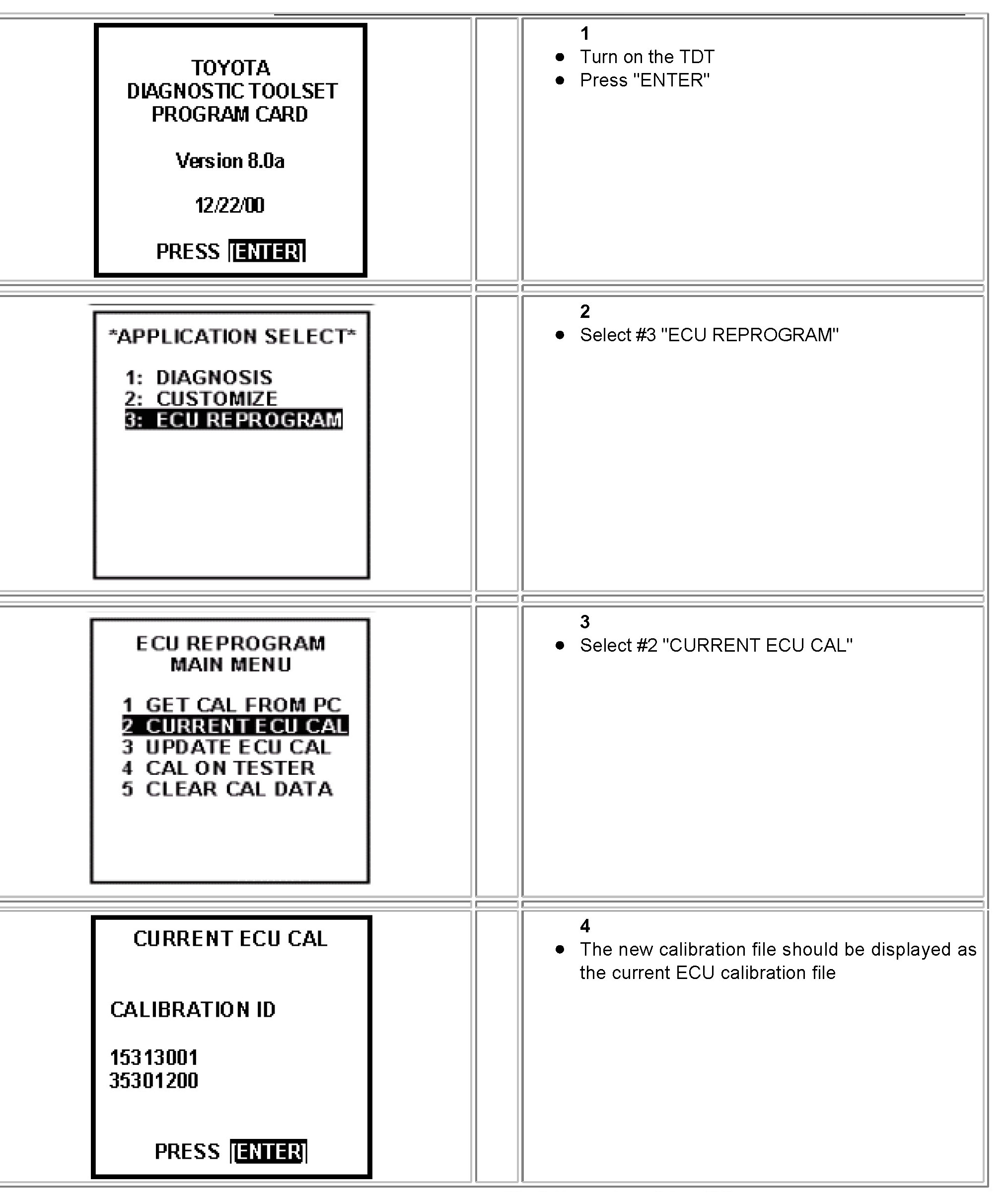 A. Connect the Diagnostic Tester to the vehicle and select CURRENT ECU CAL from the ECU REPROGRAM MAIN MENU. Determine the vehicle's current ECU calibration.