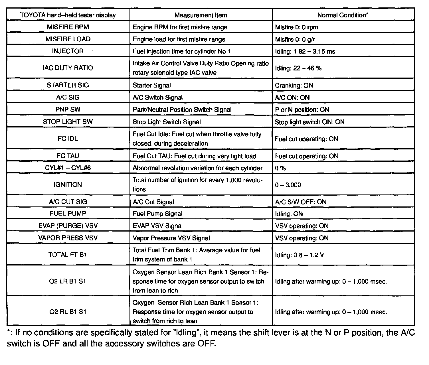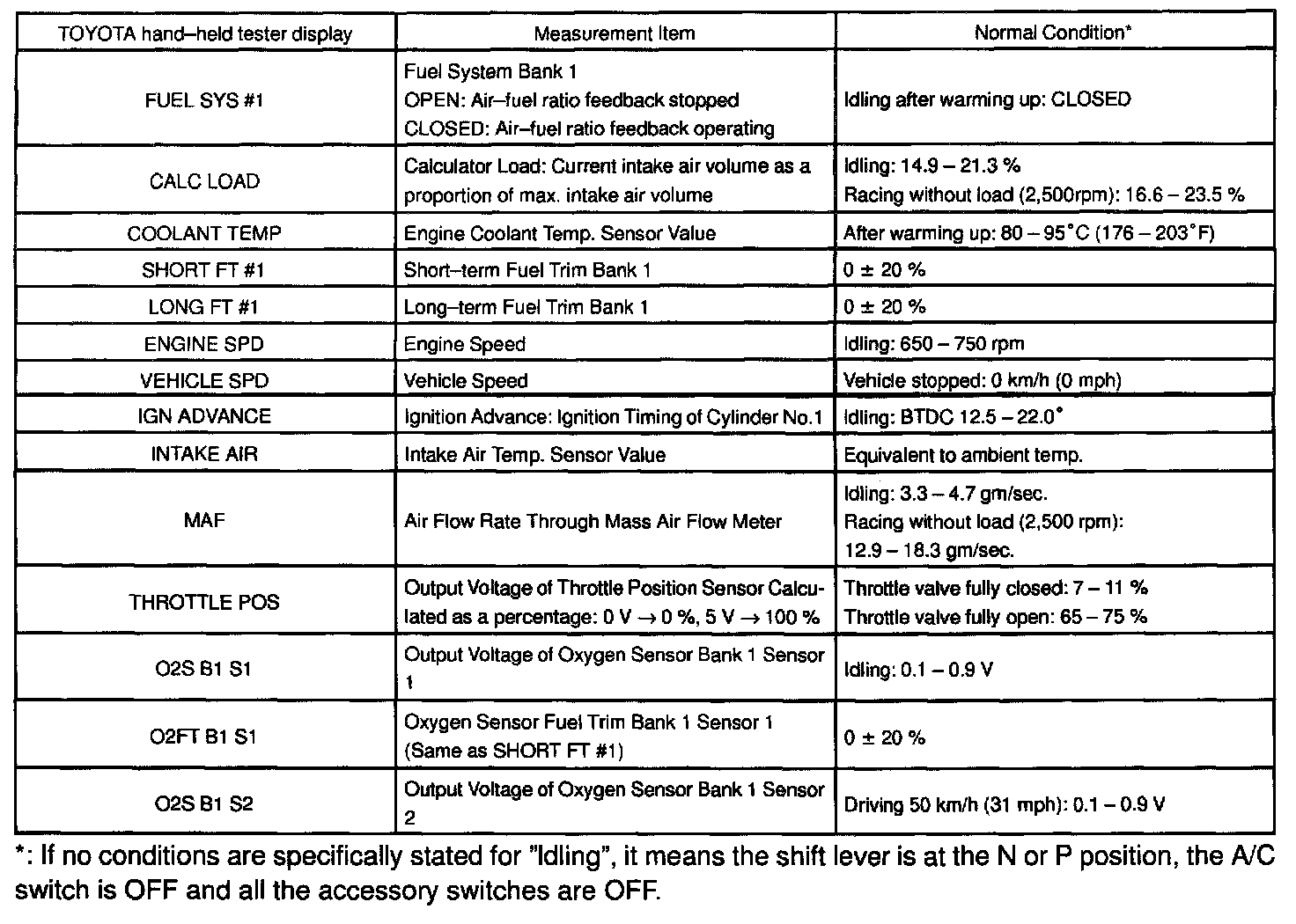 NORMAL ENGINE OPERATING CONDITIONNOTE: The values given for "Normal Condition" are representative values, so a vehicle may still be normal even if its value differs from those listed here. So do not depend solely on the "Normal Condition" here when deciding whether a part is faulty or not solely according to the "Normal Condition" here.