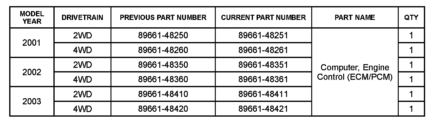 Some 2001 - 2003 model year Highlander vehicles equipped with a 1MZ-FE engine may exhibit an intermittent "pinging" or "knocking" noise when accelerating slowly up a grade. The Engine Control Module (ECM) (SAE term: Powertrain Control Module/PCM) logic has been improved to address this condition.