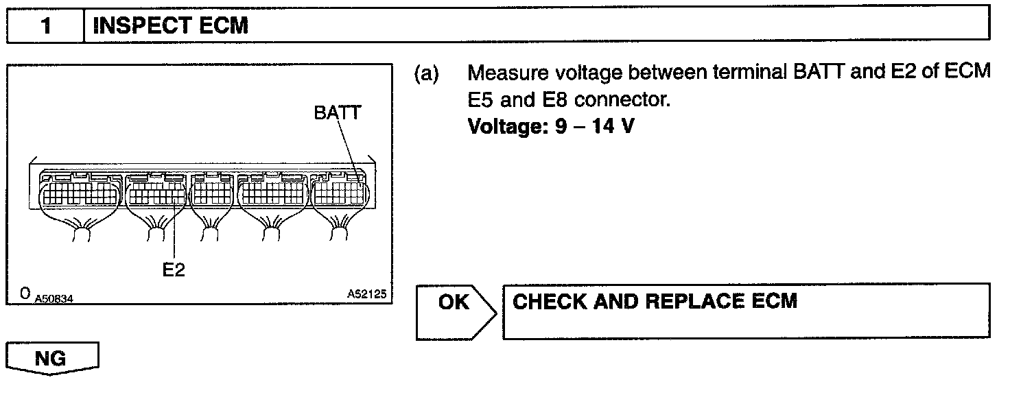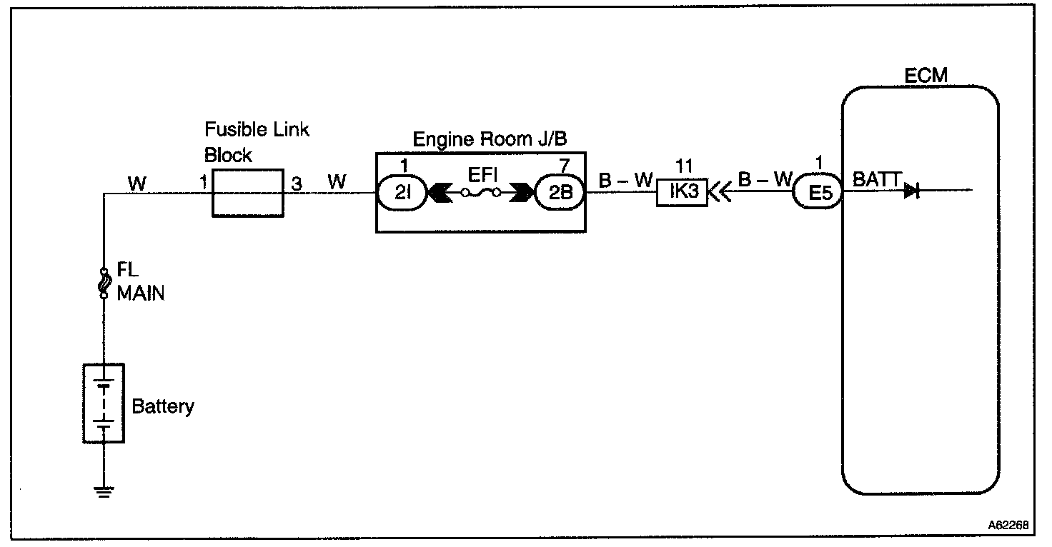 CIRCUIT DESCRIPTIONBattery positive voltage is supplied to terminal BATT of the engine ECU even when the ignition switch is OFF for use by the diagnostic trouble code memory, air/fuel ratio adaptive control value memory, etc.