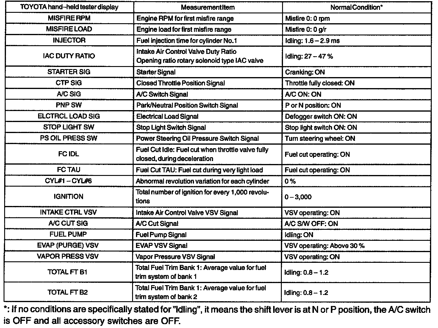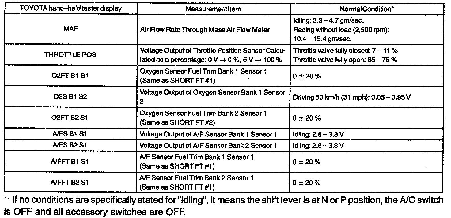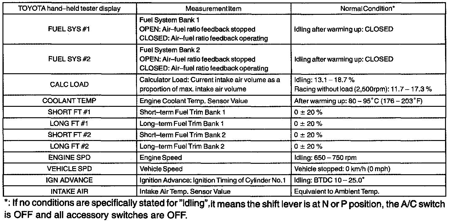 ENGINE OPERATING CONDITIONNOTE: The values given for "Normal Condition" are representative values, so a vehicle may still be normal even if its value varies differ from those listed here. So do not decide whether a part is faulty or not solely according to the "Normal Condition" here.