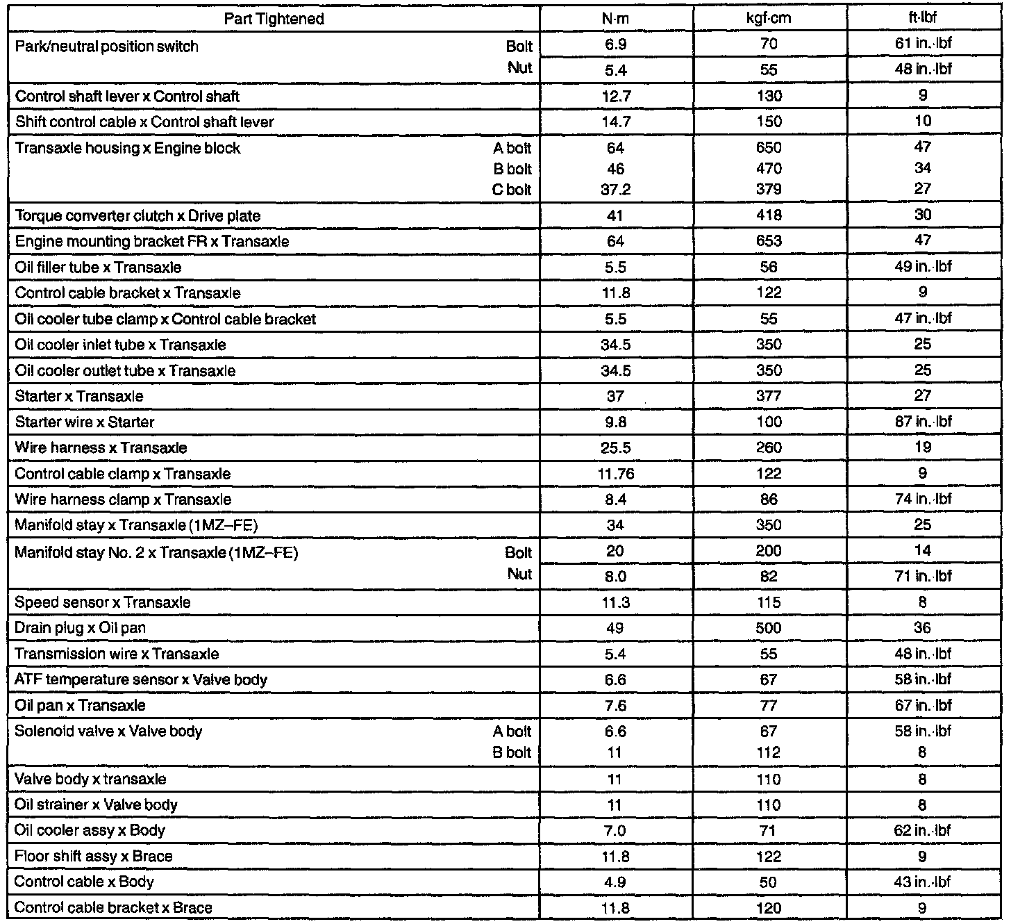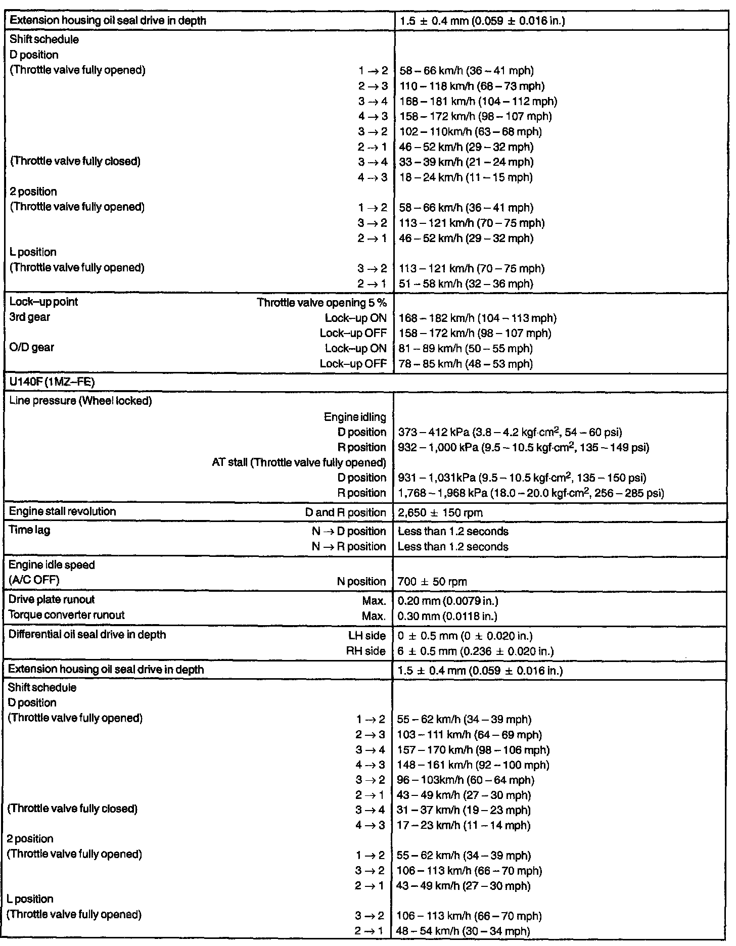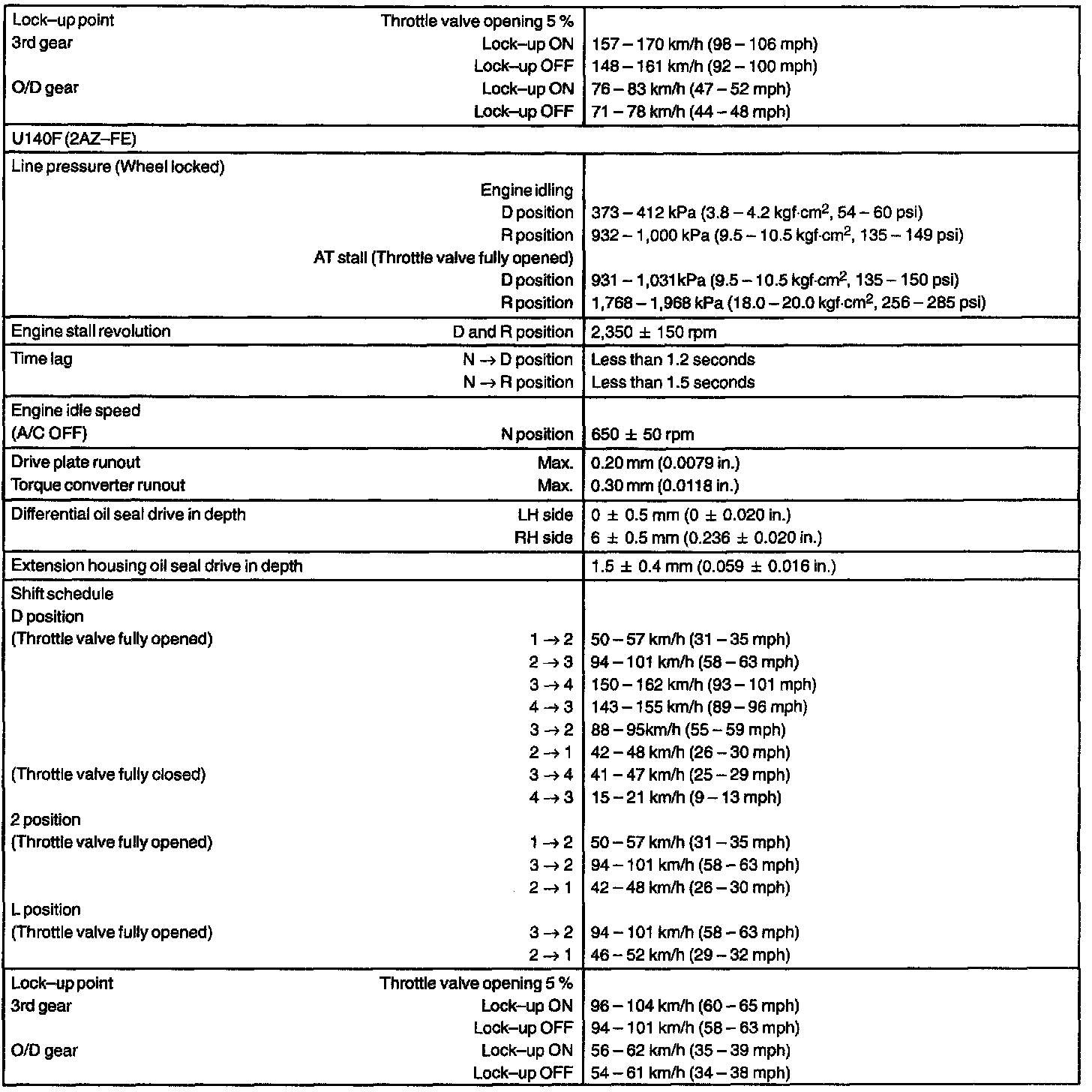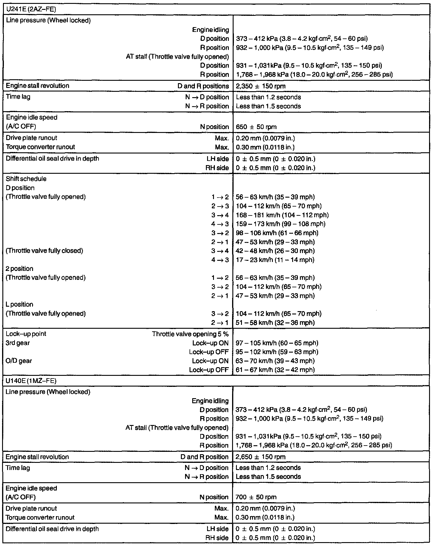 AUTOMATIC TRANSMISSION/TRANSAXLE SERVICE DATA: