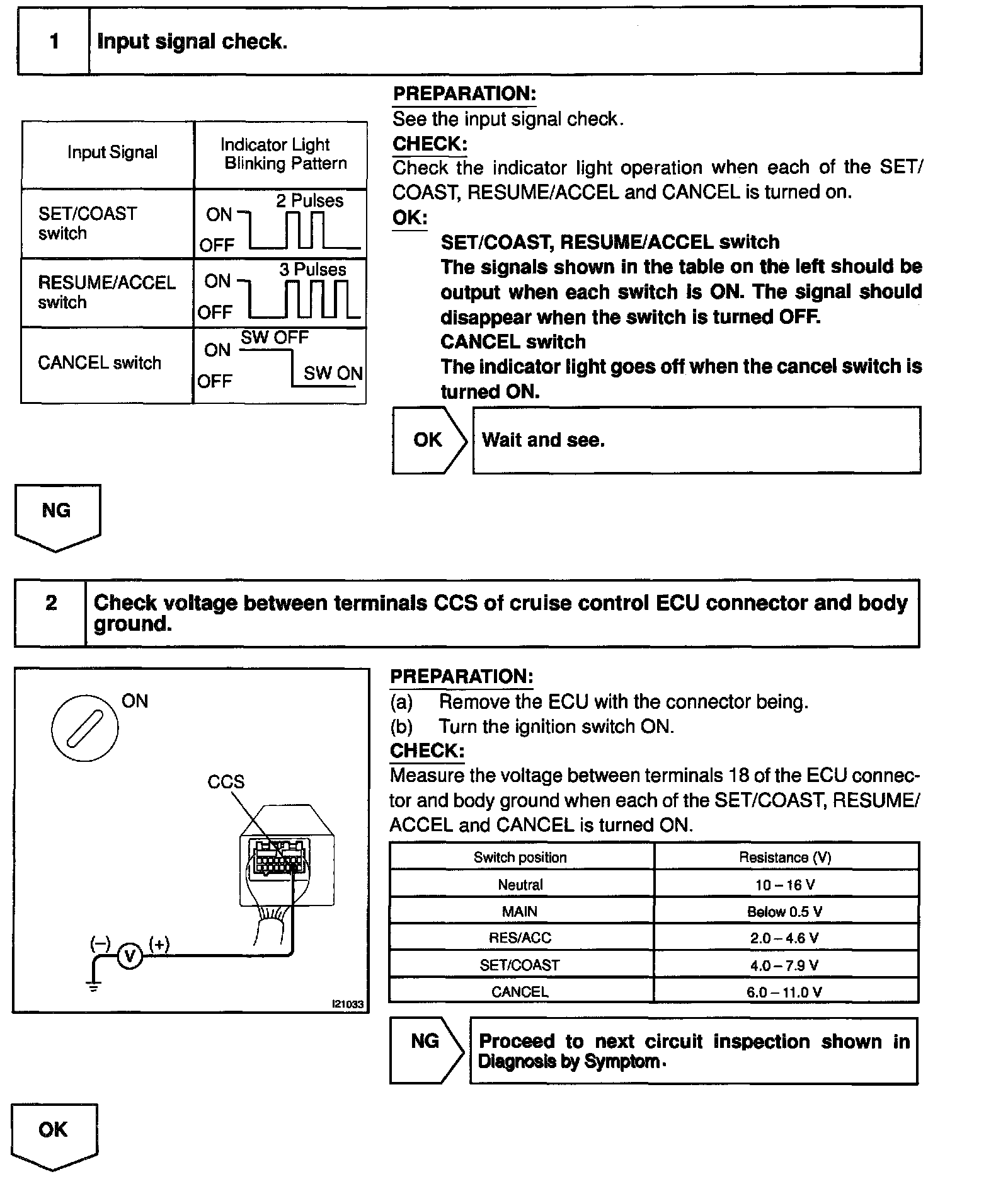 This circuit sends the SET/COAST, RESUME/ACCEL and CANCEL signals (each voltage) to the ECU.