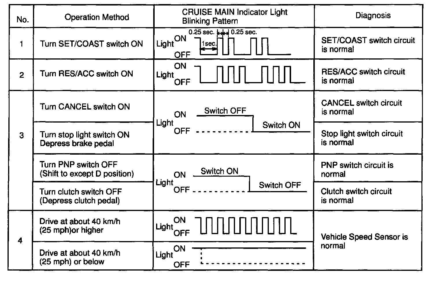 f. Read the blinking pattern of the CRUISE MAIN indicator light.