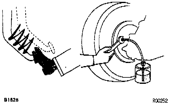 b. Depress the brake pedal several times, then loosen the bleeder plug with the pedal held down.