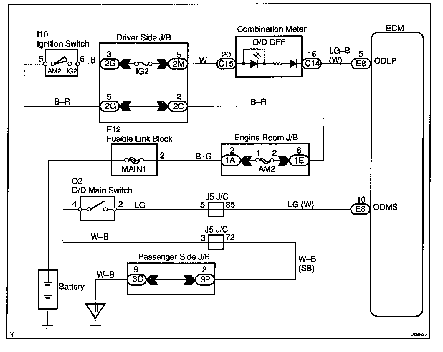 CIRCUIT DESCRIPTIONThe O/D main switch is a momentary type switch. When pressing the O/D main switch, the O/D OFF indicator light lights up and the ECM prohibits shifting into O/D, and when pressing it once again, the O/D OFF indicator light goes off and the ECM allows shifting into O/D. Turning the IG switch OFF will reset the O/D OFF indicator light.