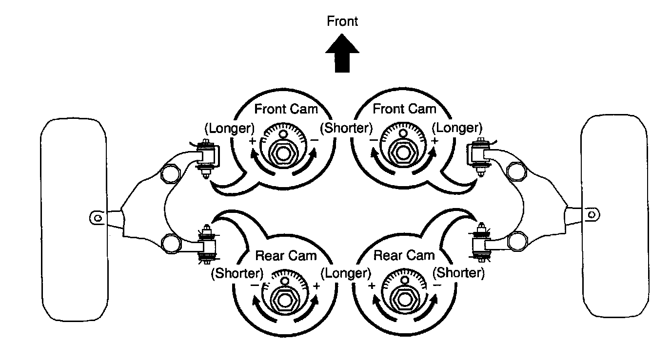 b. Adjust the camber and caster by front and/or rear adjusting cams.