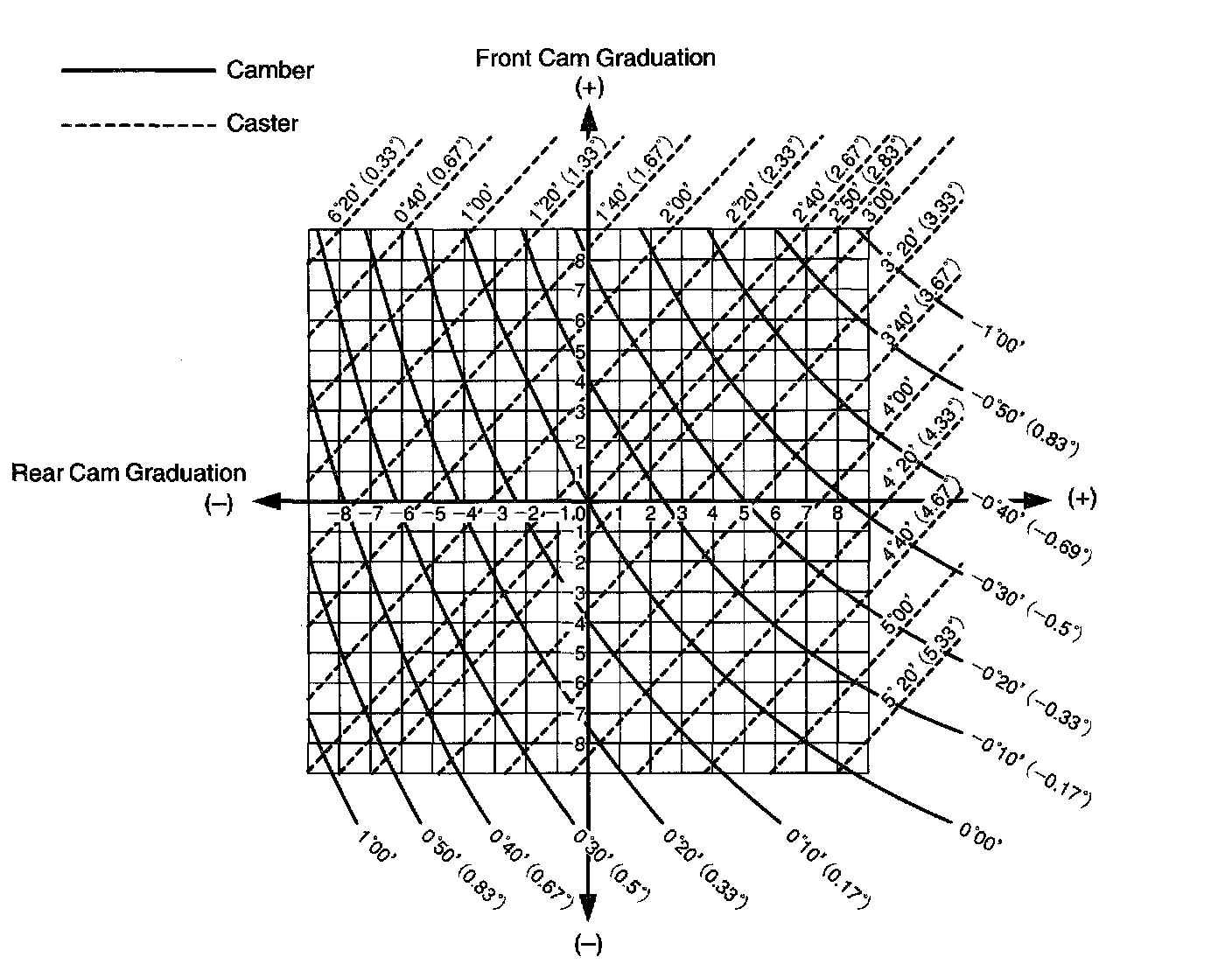 4) As shown in the chart, read the distance from the measured value to the standard value, and adjust the front and/or rear adjusting cams accordingly.