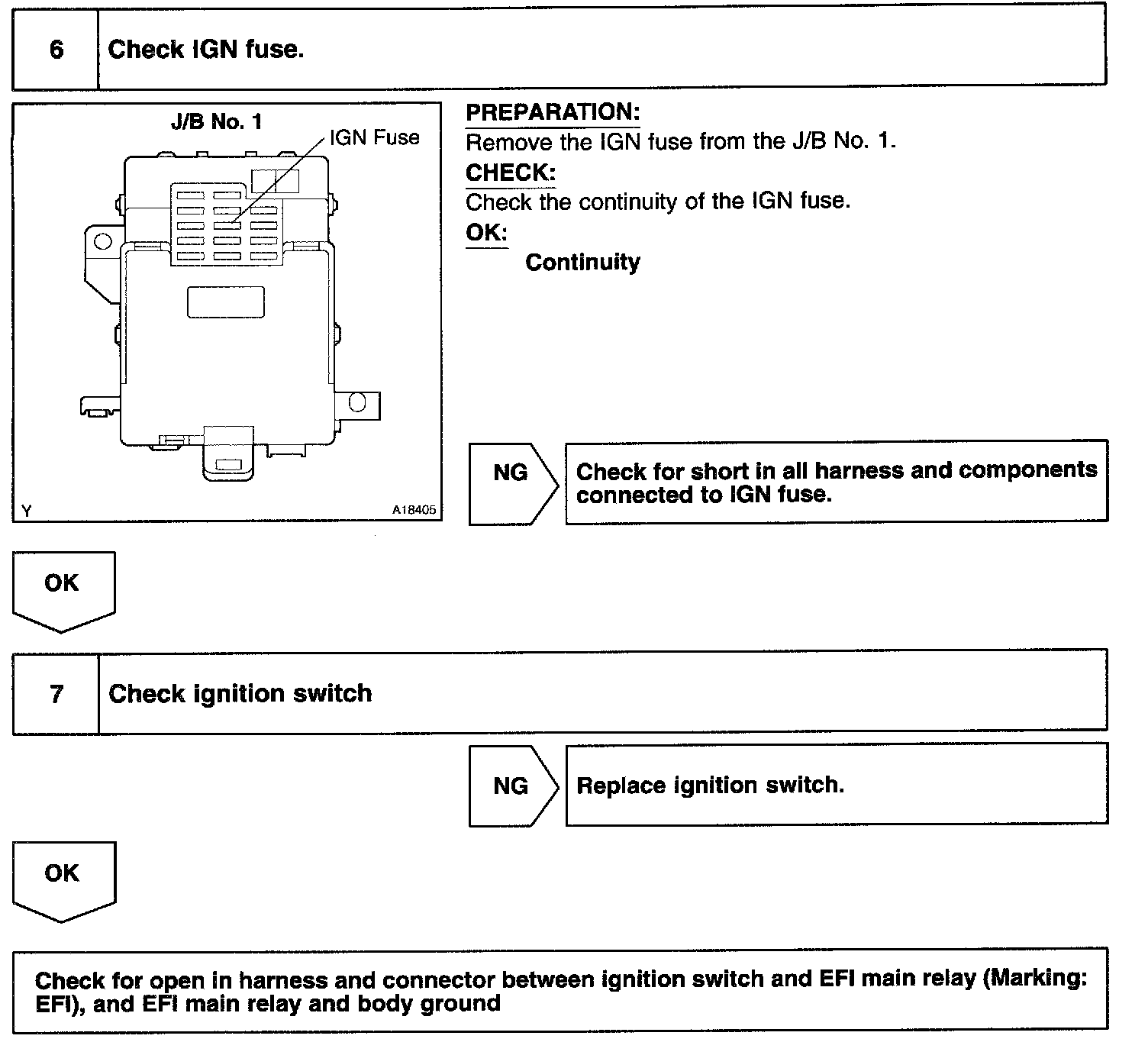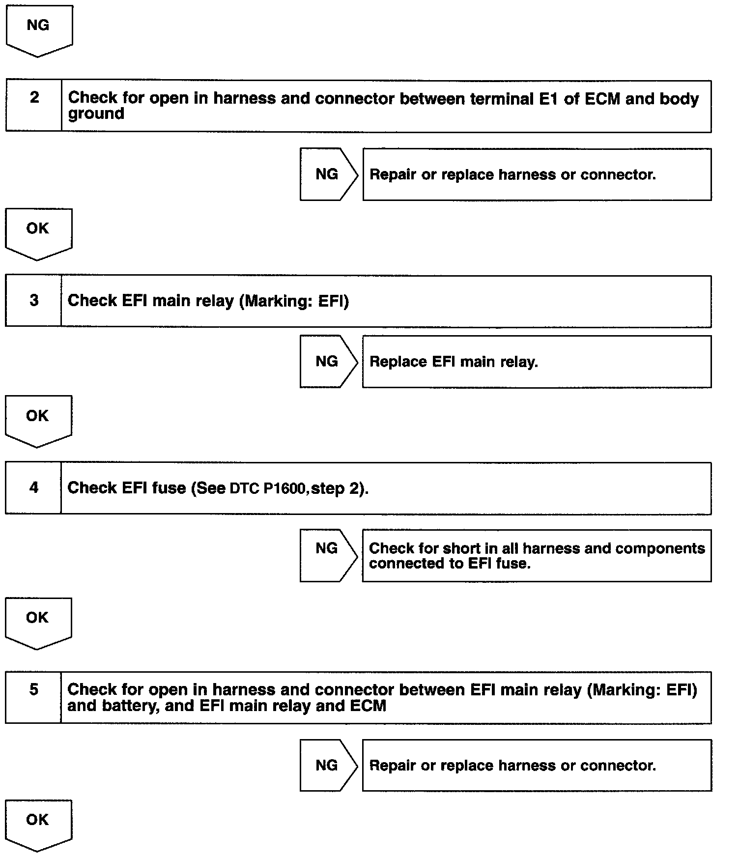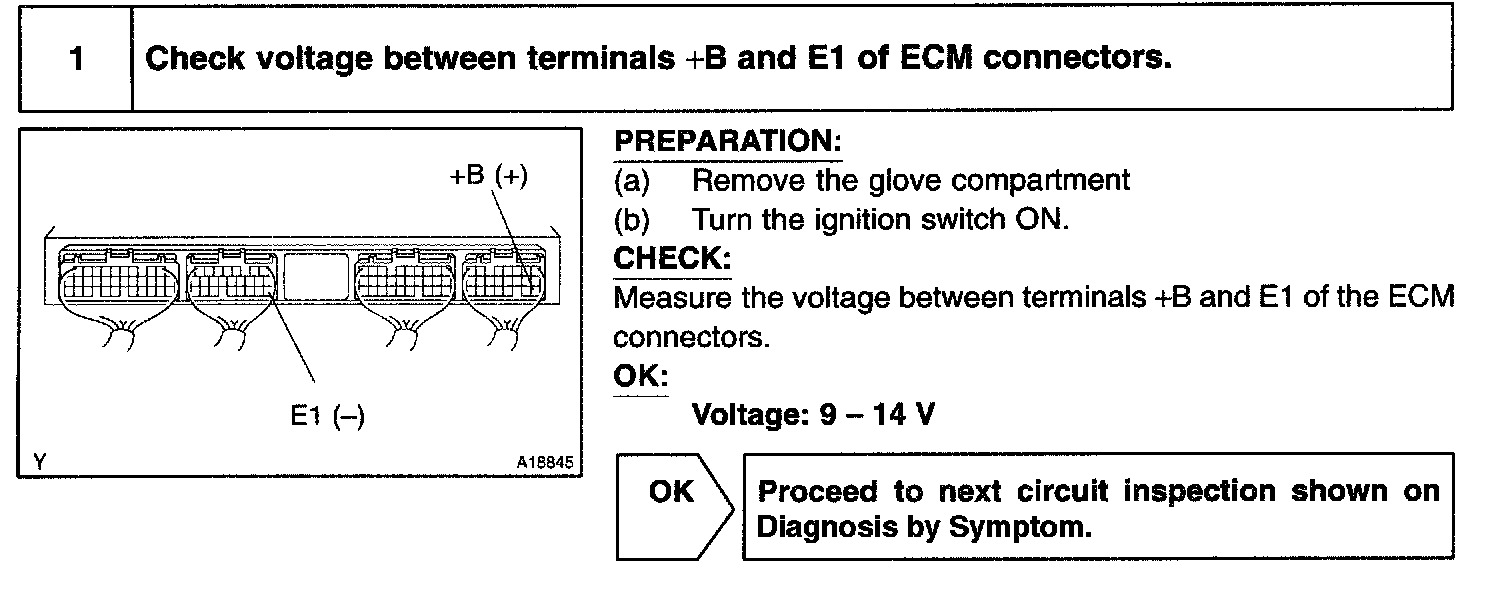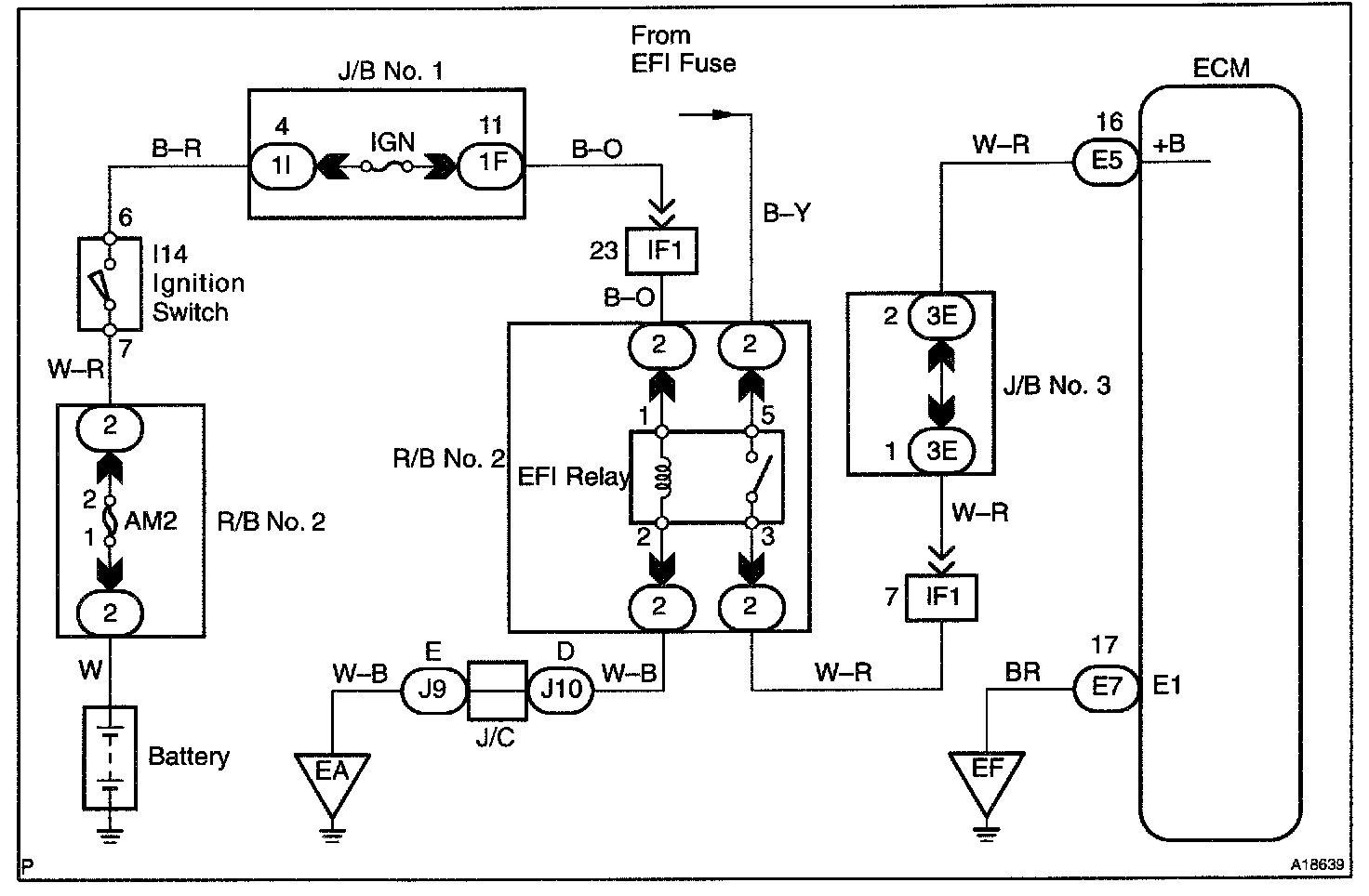 CIRCUIT DESCRIPTIONWhen the ignition switch is turned ON, battery positive voltage is applied to the coil, closing the contacts of the EFI main relay (Marking: EFI) and supplying power to terminal +B of the ECM.