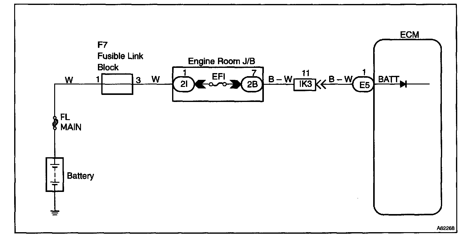 CIRCUIT DESCRIPTIONBattery positive voltage is supplied to terminal BATT of the ECM even when the ignition switch is OFF for use by the diagnostic trouble codes memory, air-fuel ratio adaptive control value memory, etc.
