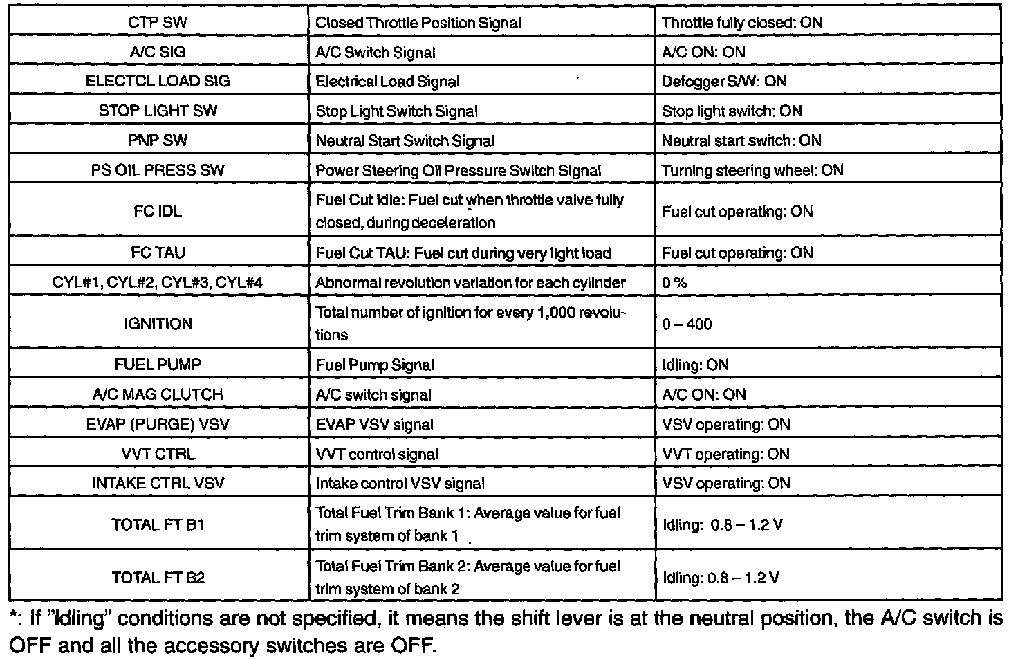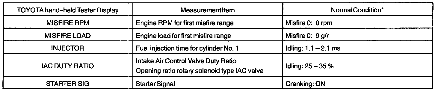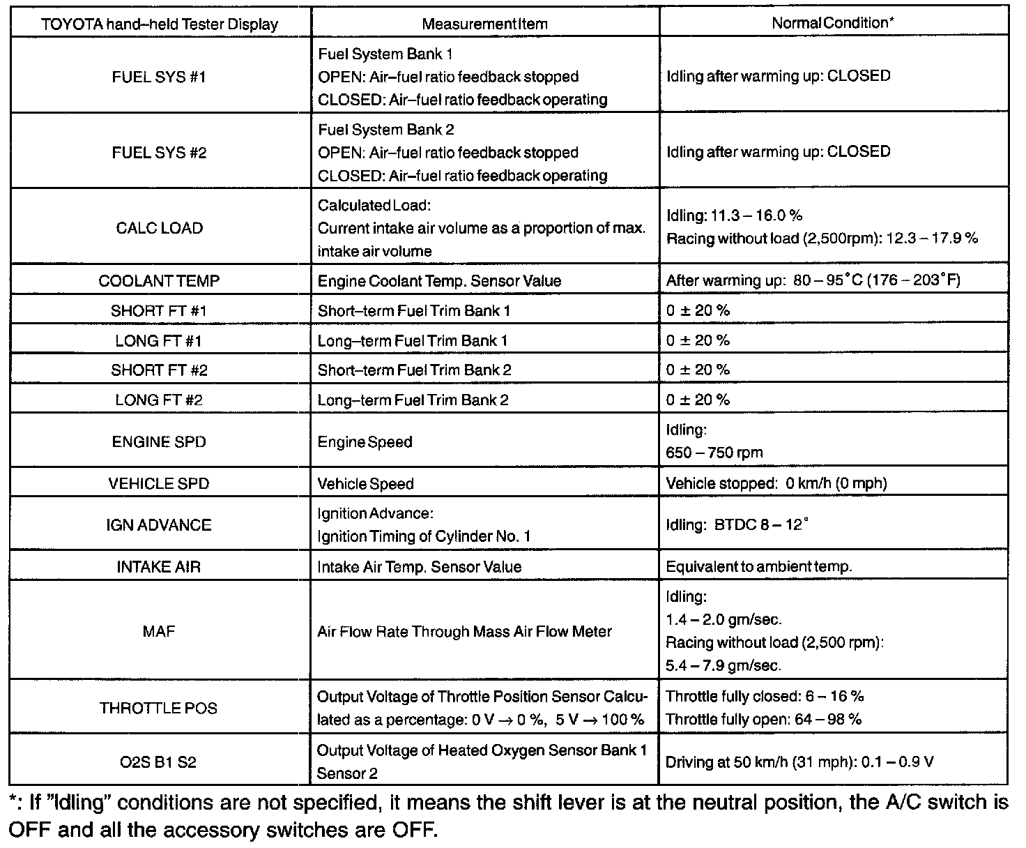 Engine Operating ConditionNOTE: The values given for "Normal Condition" are representative values. So, a vehicle may still be normal even if its value differs from those listed here. So, do not depend solely on the "Normal Condition" here when whether the part is faulty or not.