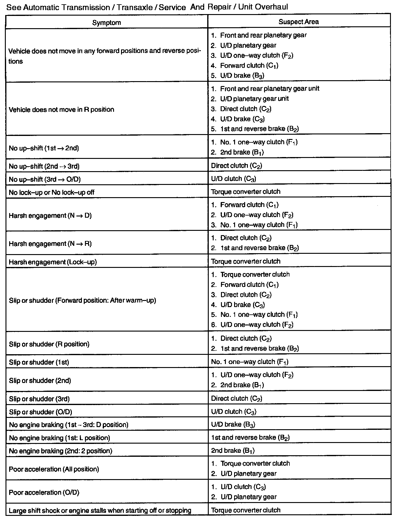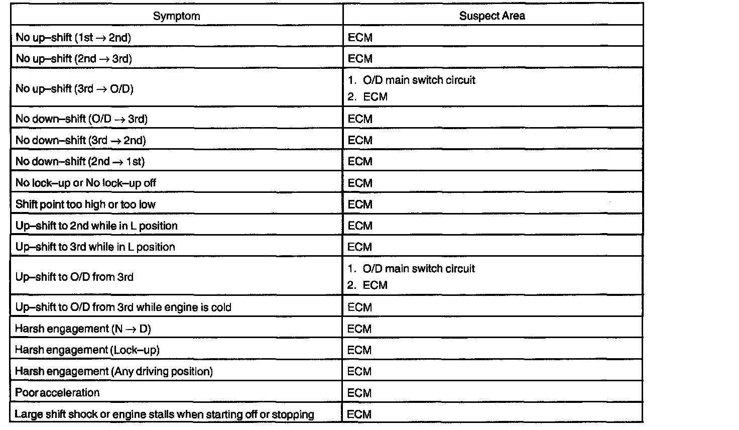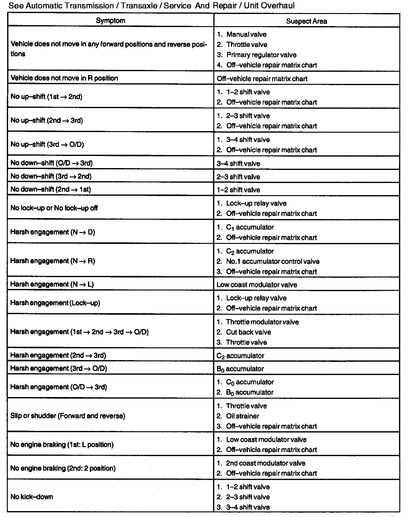 Problem Symptoms TableIf a normal code is displayed during the diagnostic trouble code check although the trouble still occurs, check the circuits for each symptom in the order given in the charts and proceed to the given troubleshooting.