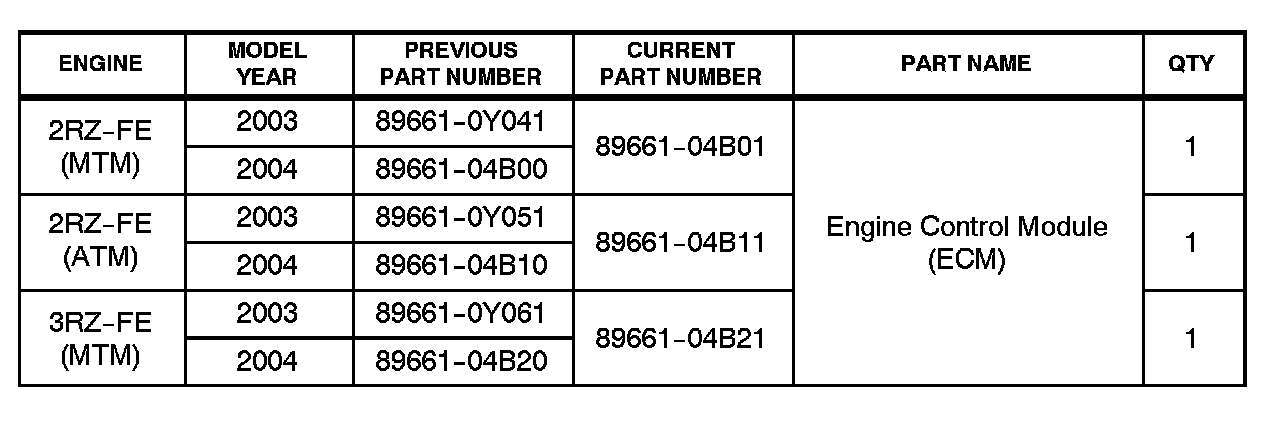 Under certain driving conditions, some 2003 - 2004 model year 4 cylinder 2RZ-FE (ATM and MTM) and 3RZ-FE (MTM only) Tacoma vehicles may exhibit a M.I.L. "ON" condition with DTC P0136 Oxygen Sensor Circuit Malfunction (Bank 1, Sensor 2). The Engine Control Module (ECM) (SAE term: Power Control Module/PCM) has been modified to prevent this condition.