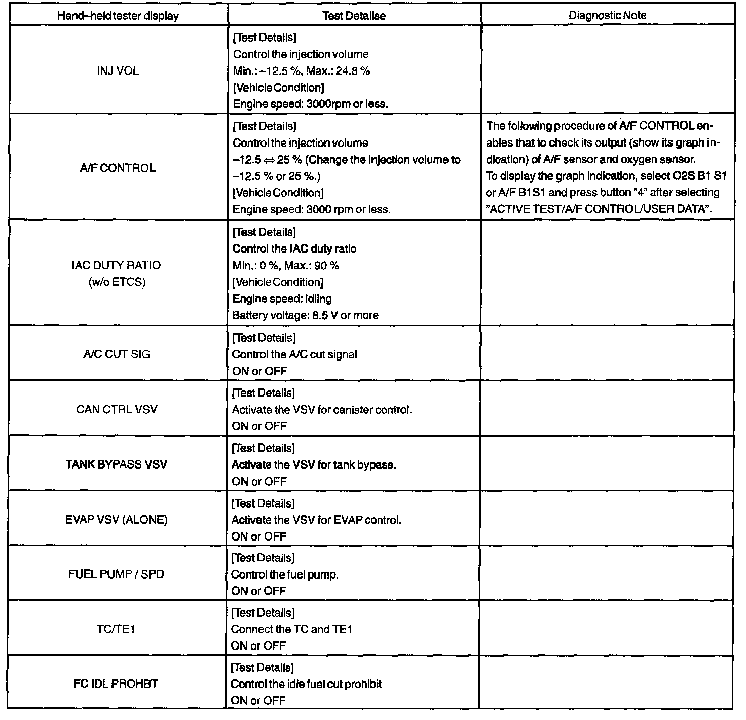 ACTIVE TESTHINT: Performing the ACTIVE TEST using the OBD II scan tool or Hand-held tester allows the relay, VSV, actuator and so on to operate without parts removal. Performing the ACTIVE TEST as a first step of troubleshooting is one of the method to shorten the labor time.