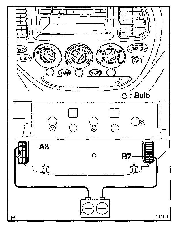 Connect the positive (+) lead from the battery to terminal B7 and negative (-) lead to terminal AB then check that the illuminations lights up.