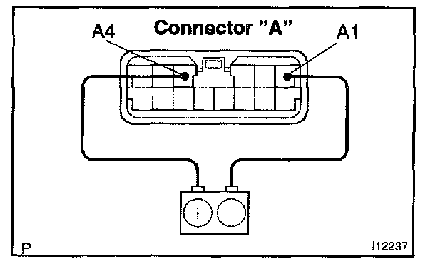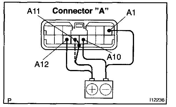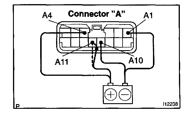 c. Connect the positive (+) lead from the battery to terminal A11 and negative (-) lead to terminal A10, then check that the indicator dimes.