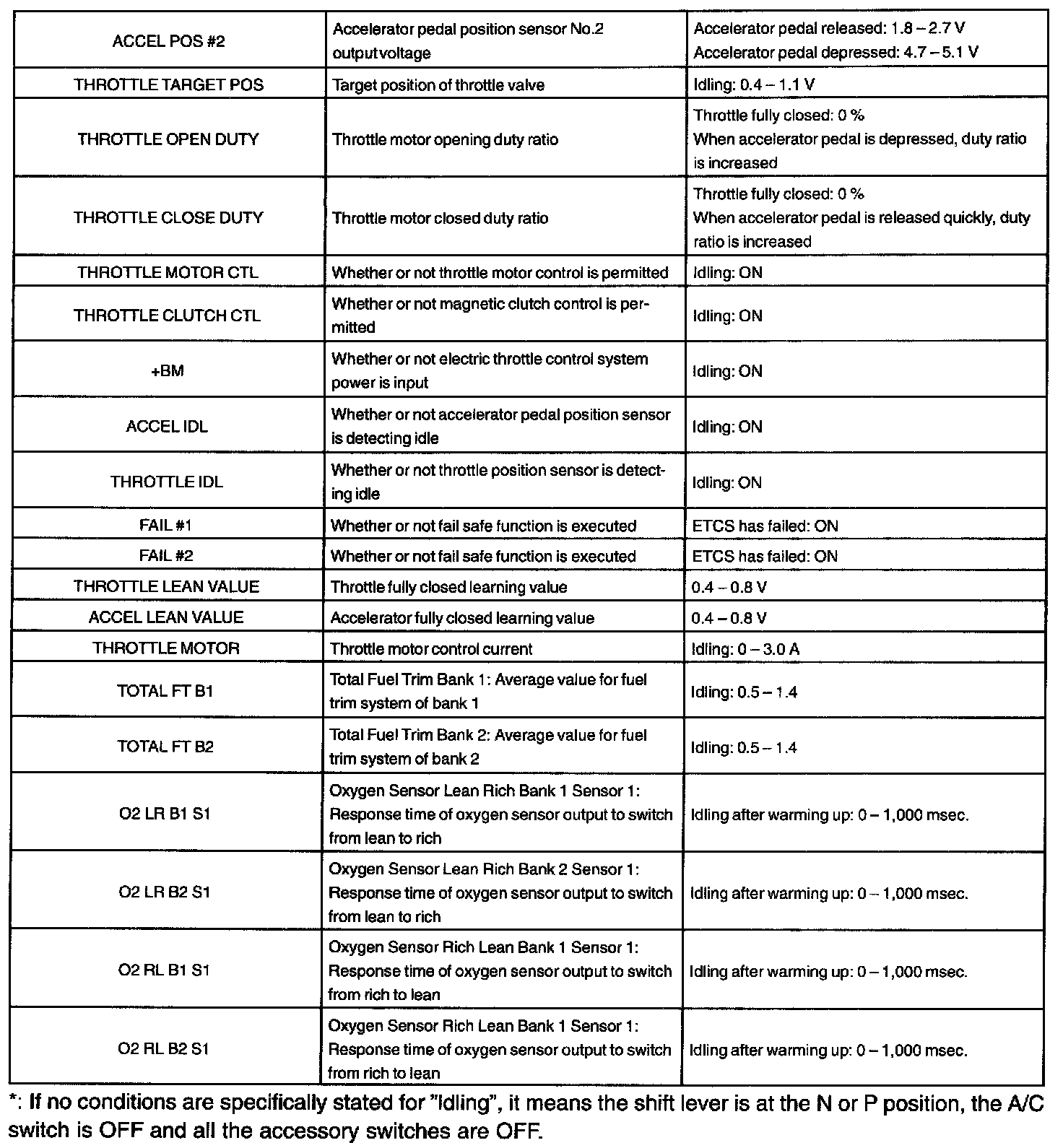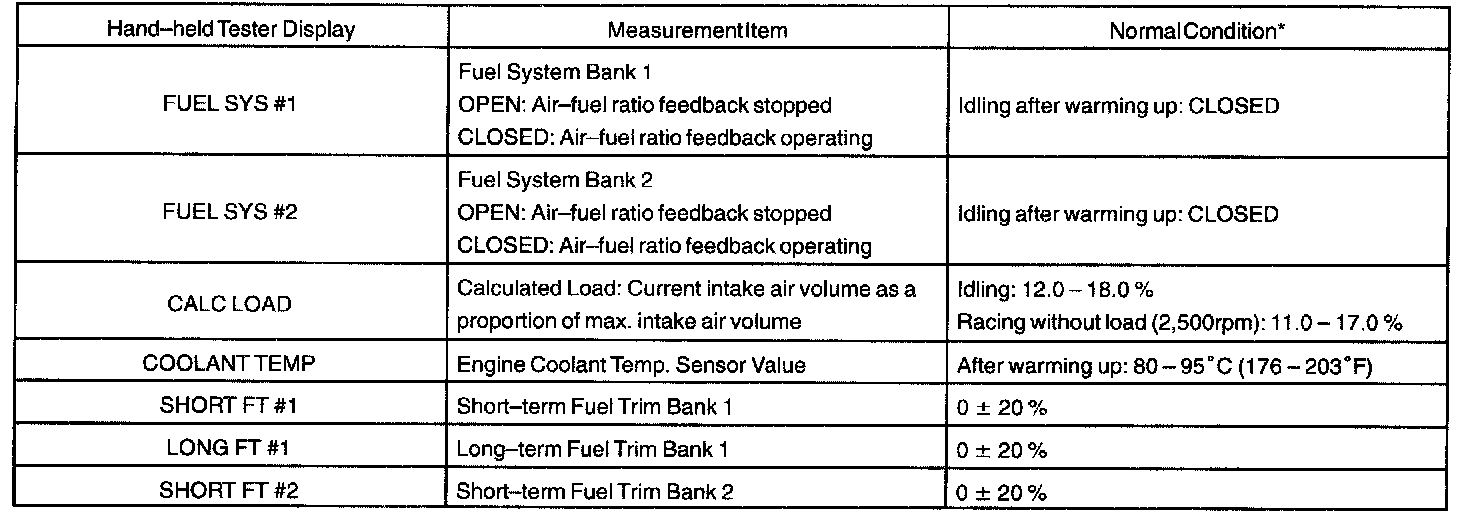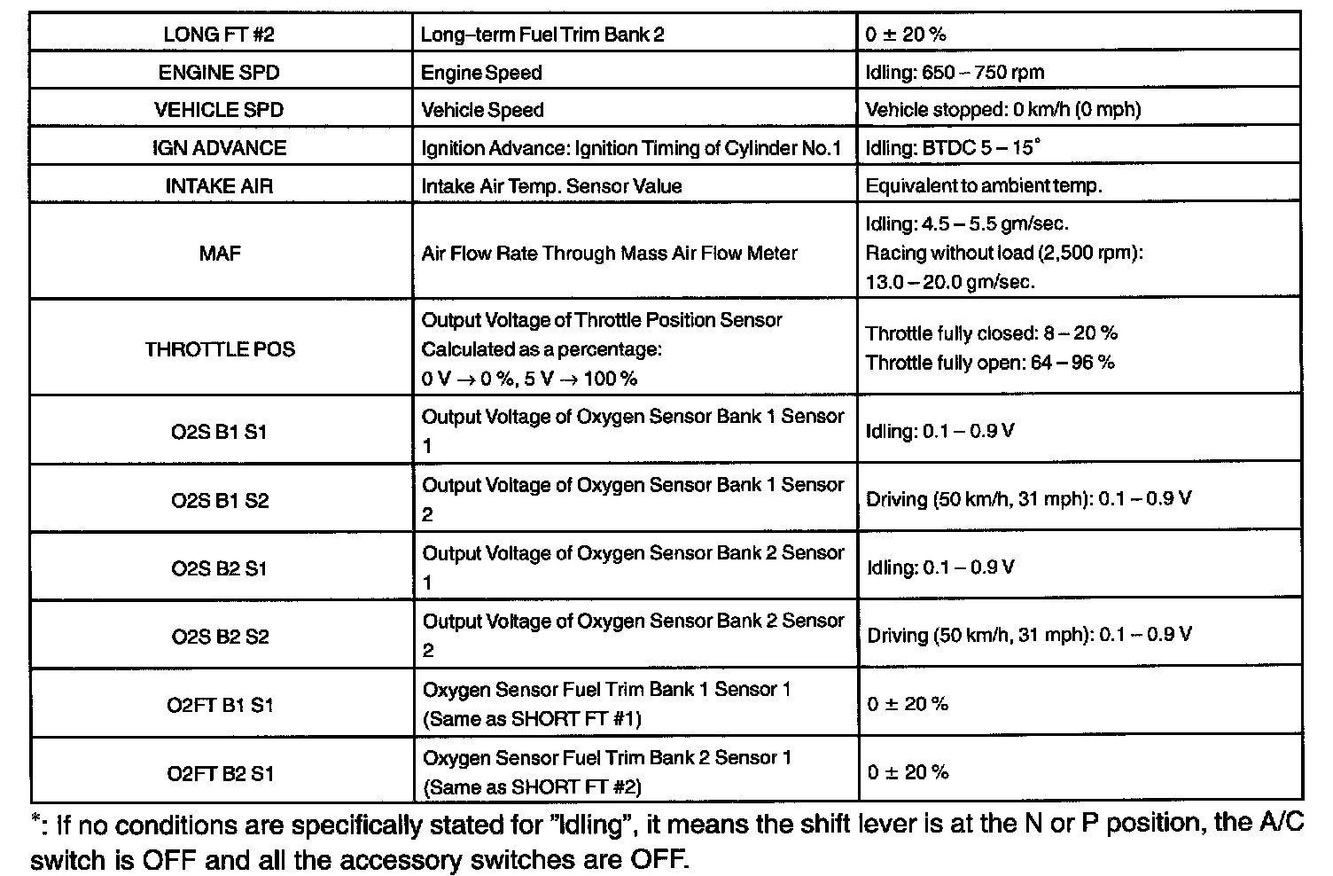 ENGINE OPERATING CONDITIONNOTE: The values given below for "Normal Condition" are representative values. So, a vehicle may still be normal even if its value differs from those listed here. So, do not solely depend on the "Normal Condition" here when deciding whether a part is faulty or not.