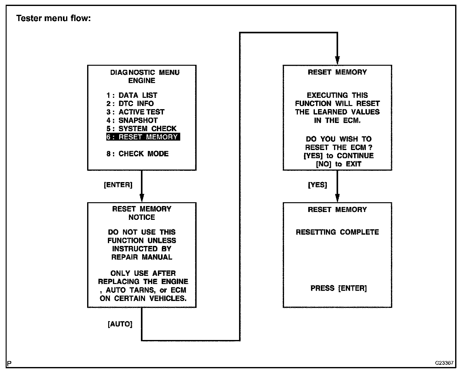 CAUTION: Perform the RESET MEMORY (AT initialization) when replacing the automatic transmission assy, engine assy or ECM.