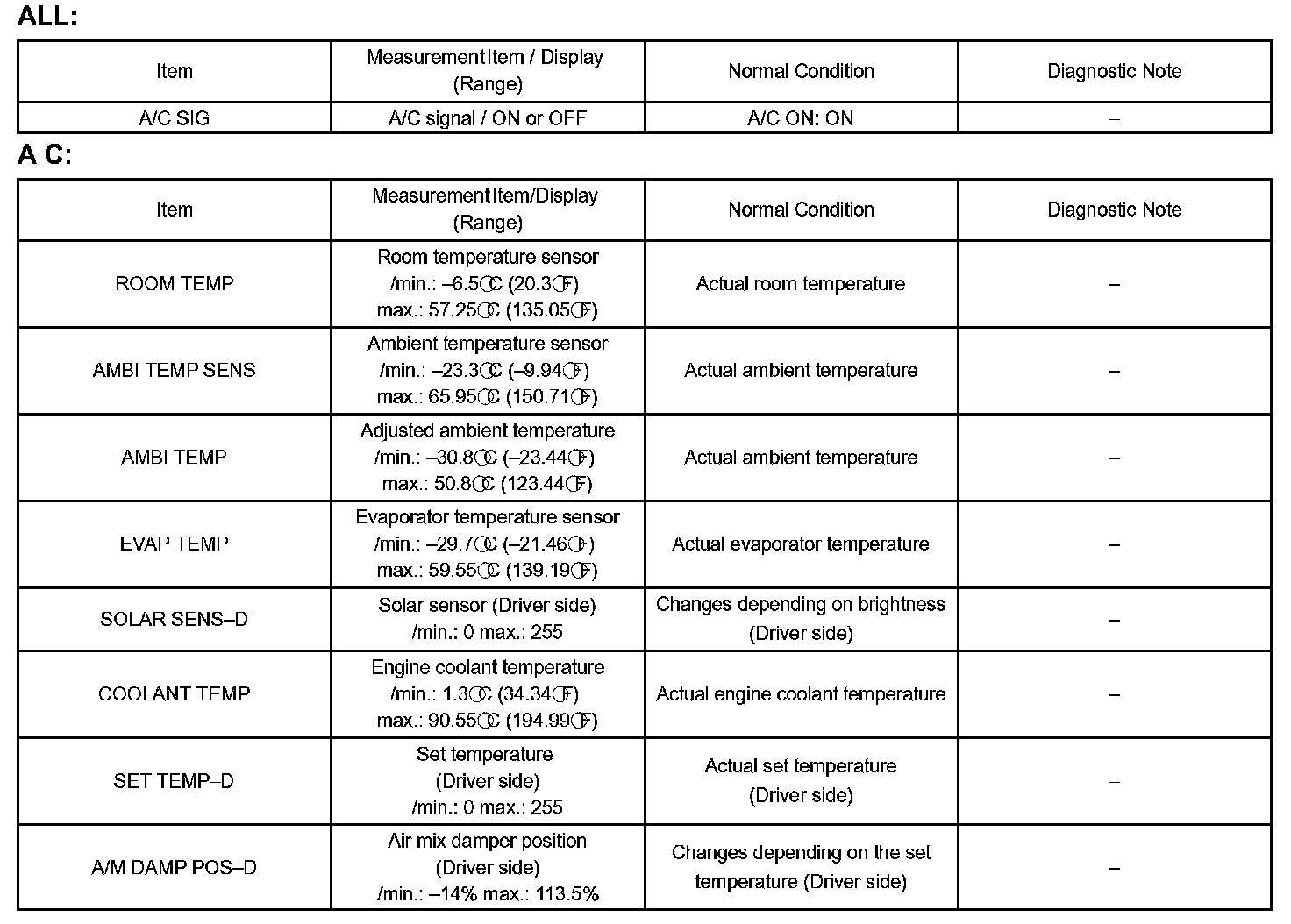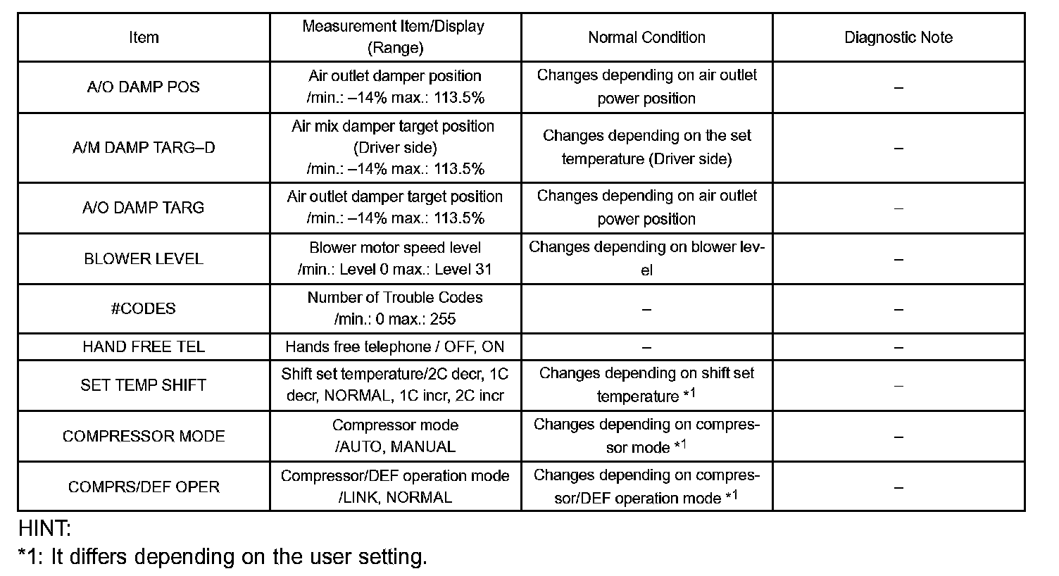DATA LISTHINT: From the DATA LIST displayed on the hand-held tester, you can read the values of the displays, sensors, actuators and so on without parts removal. Reading the DATA LIST as the first step of troubleshooting is one way to shorten labor time.