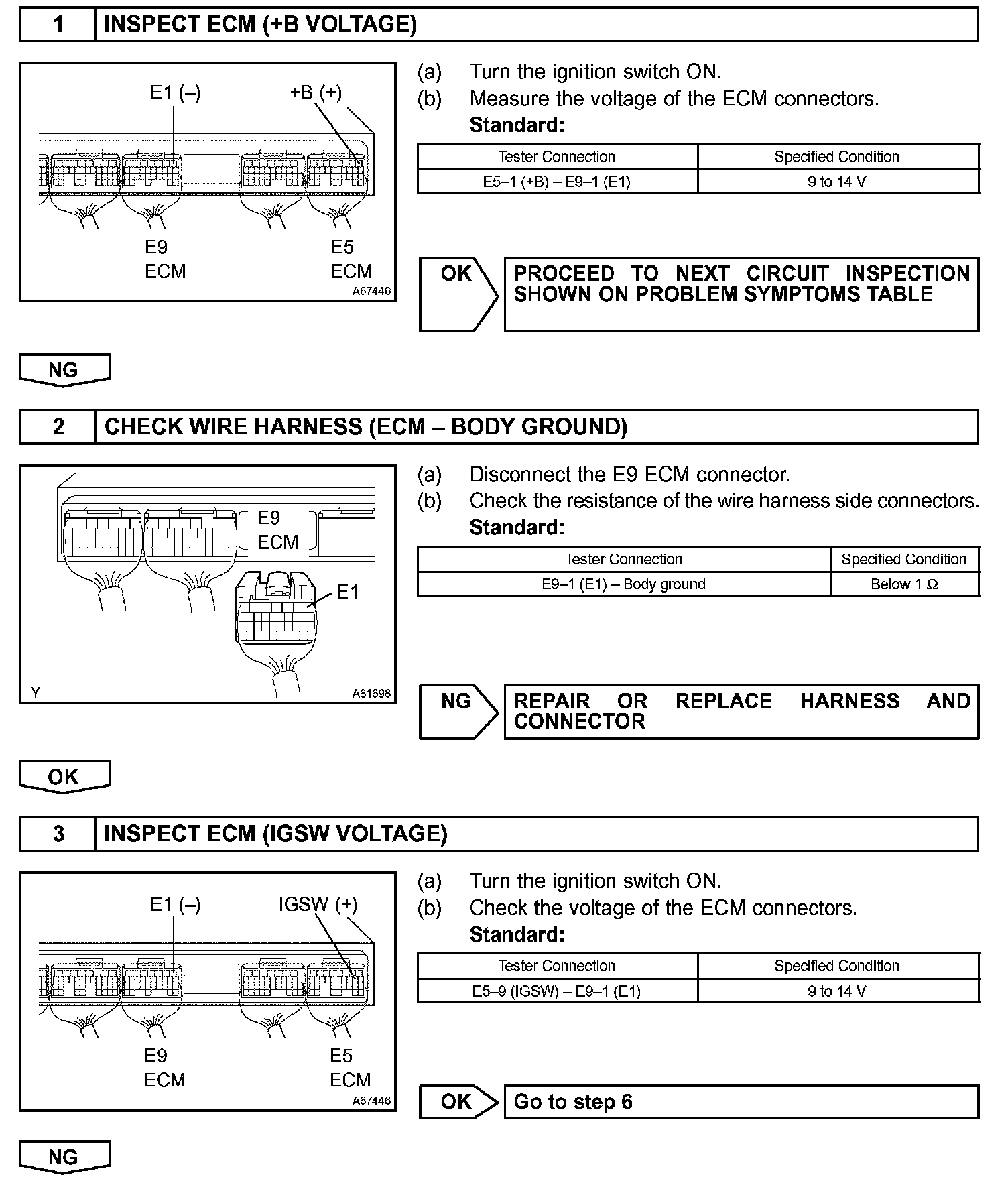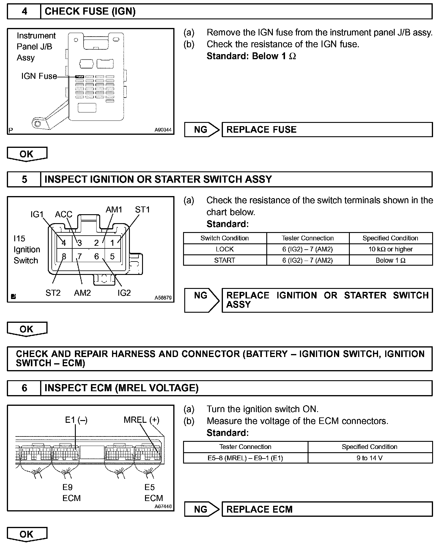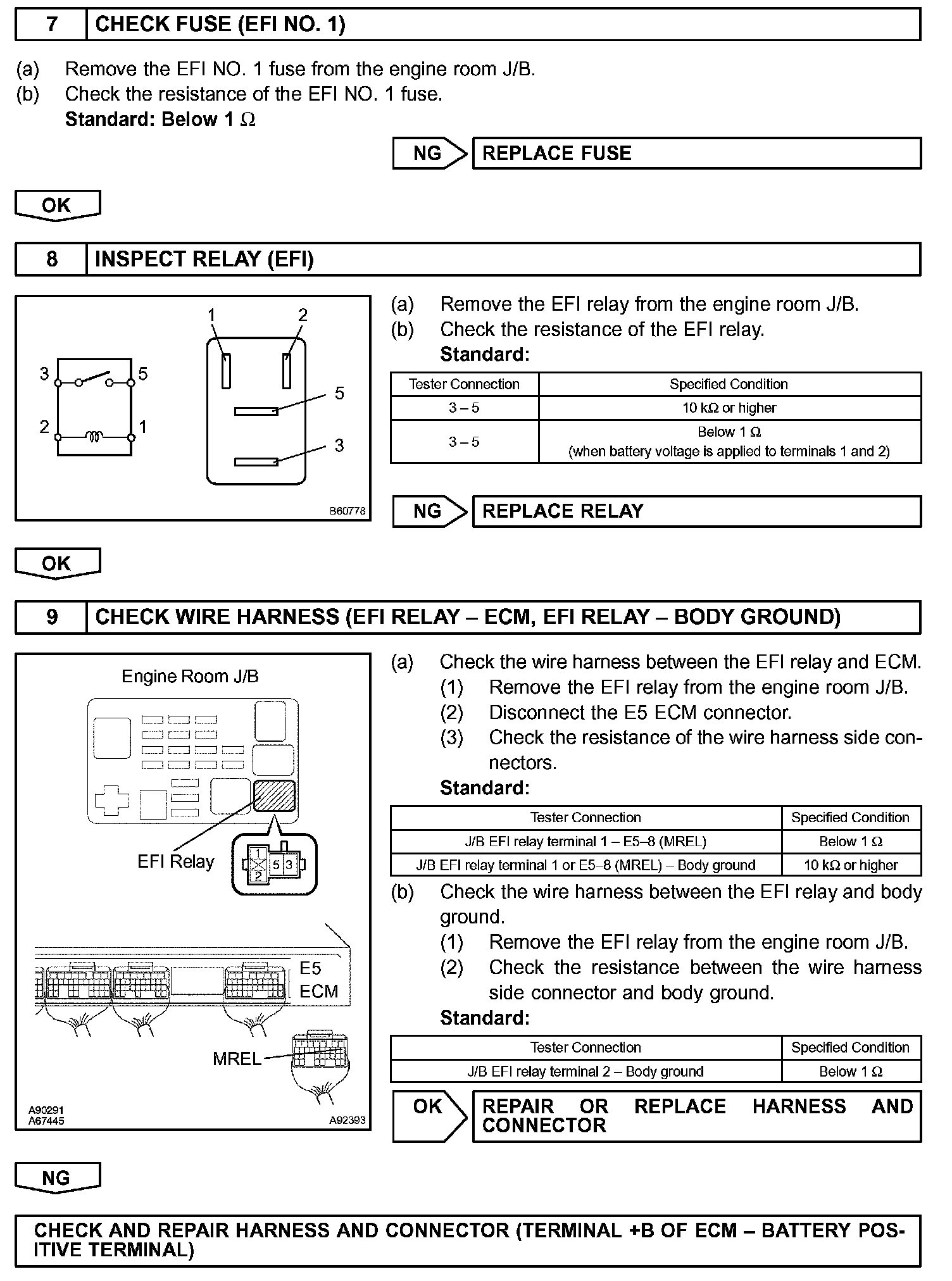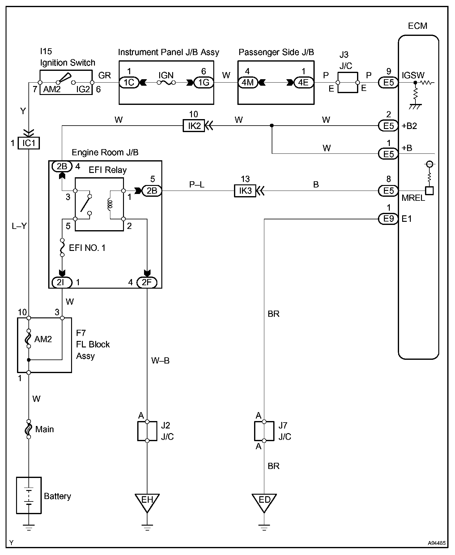 When the ignition switch is turned ON, battery voltage is applied to terminal IGSW of the ECM. The ECM "MREL" output signal causes current to flow to the coil, closing the contacts of the EFI main relay (Marking: EFI) and supplying power to terminal +B of the ECM.