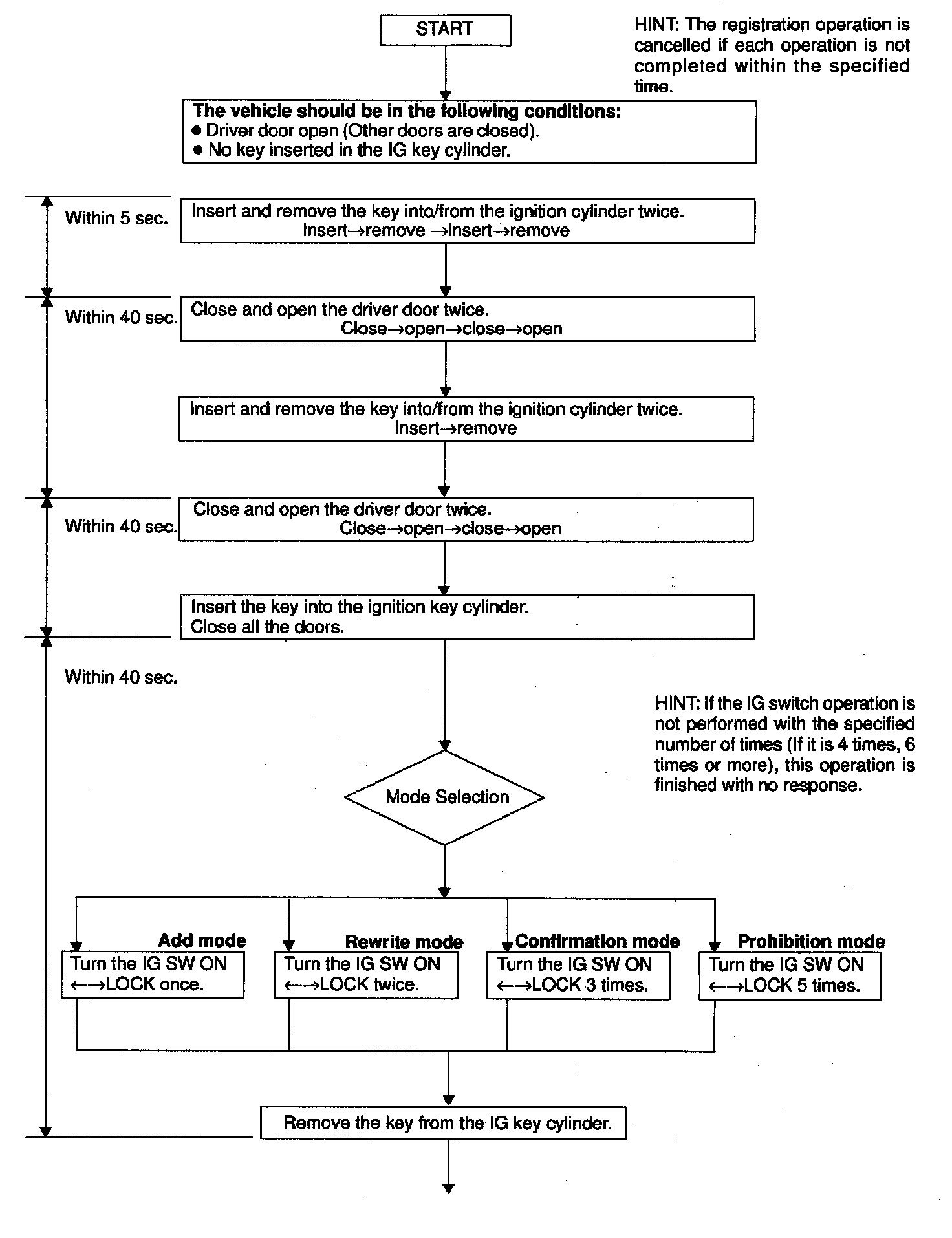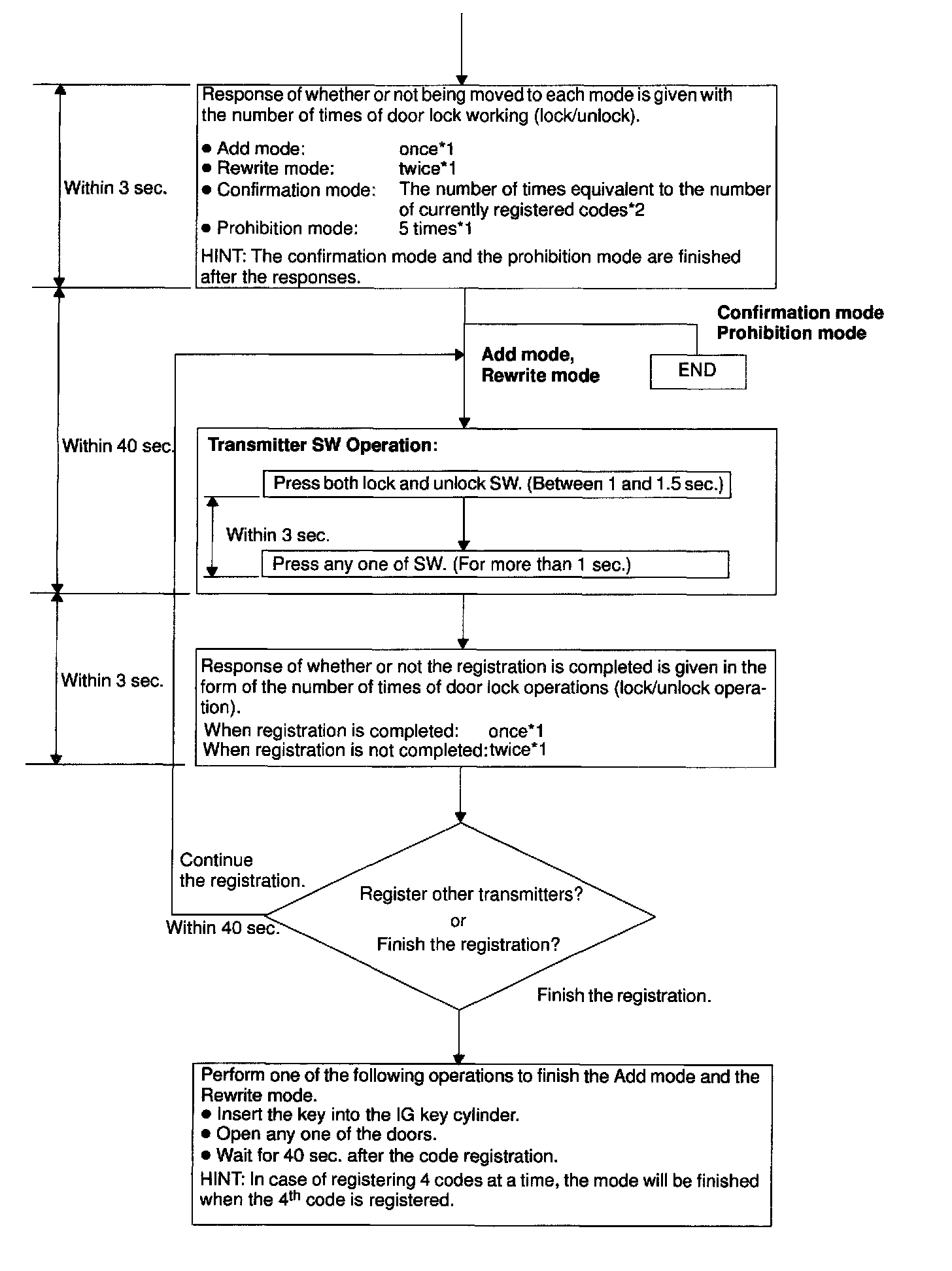 - The add mode is used to retain codes already registered while you register new recognition codes. This mode is used when adding a transmitter. However, if the number of registered codes exceeds 4 codes, previously registered codes are correspondingly erased in order, starting from the first registered code.