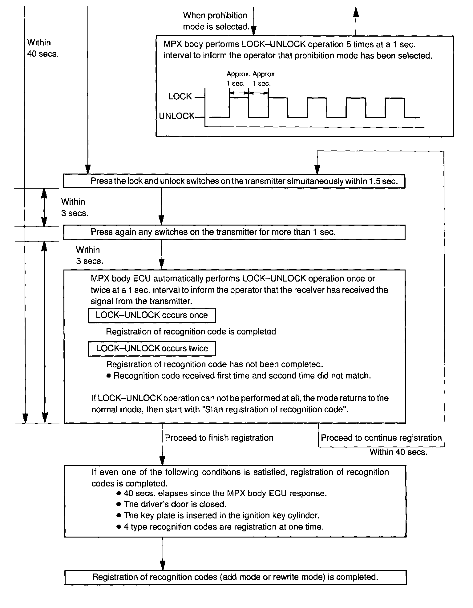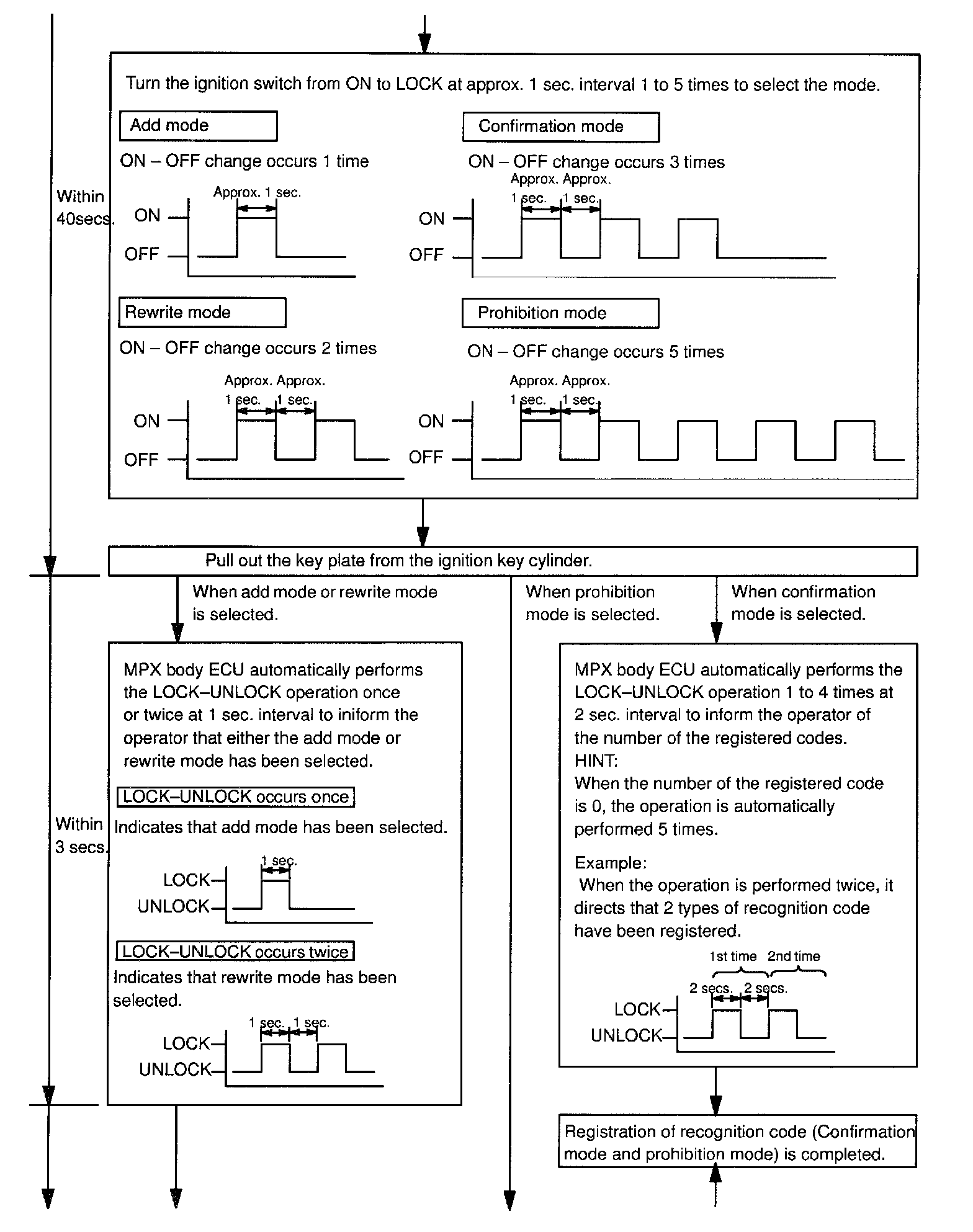 - The add mode is used to retain codes already registered while you register new recognition codes. This mode is used when adding a transmitter. However, if the number of registered codes exceeds 4 codes, previously registered codes are correspondingly erased in order, starting from the first registered code.