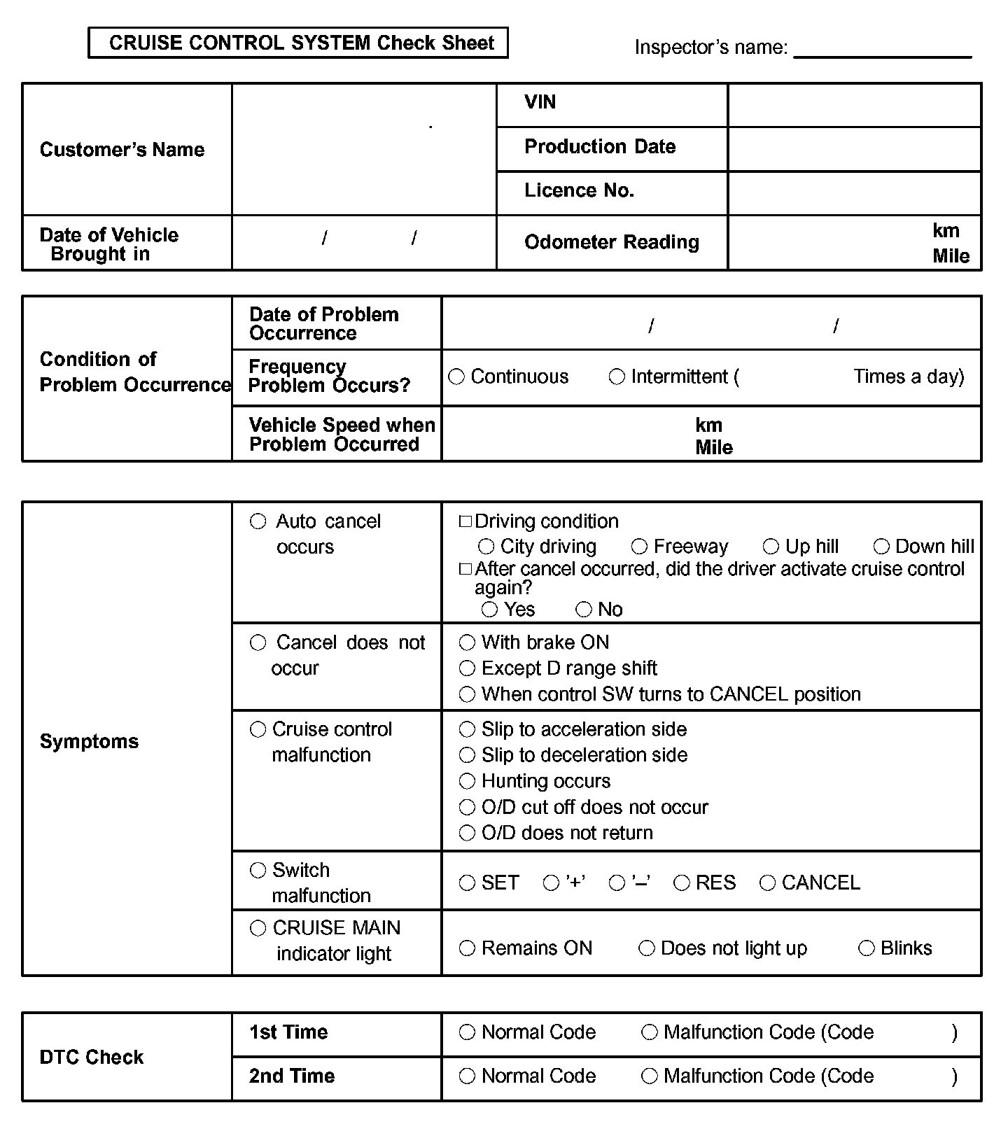 Cruise Control System Check Sheet:
