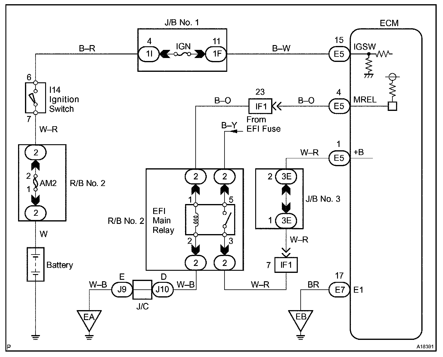 When the ignition switch is turned to ON, positive battery voltage is applied to terminal IGSW of the ECM and the EFI main relay (Marked: EFI) control circuit in the ECM sends a signal to terminal MREL of the ECM switching on the EFI main relay.