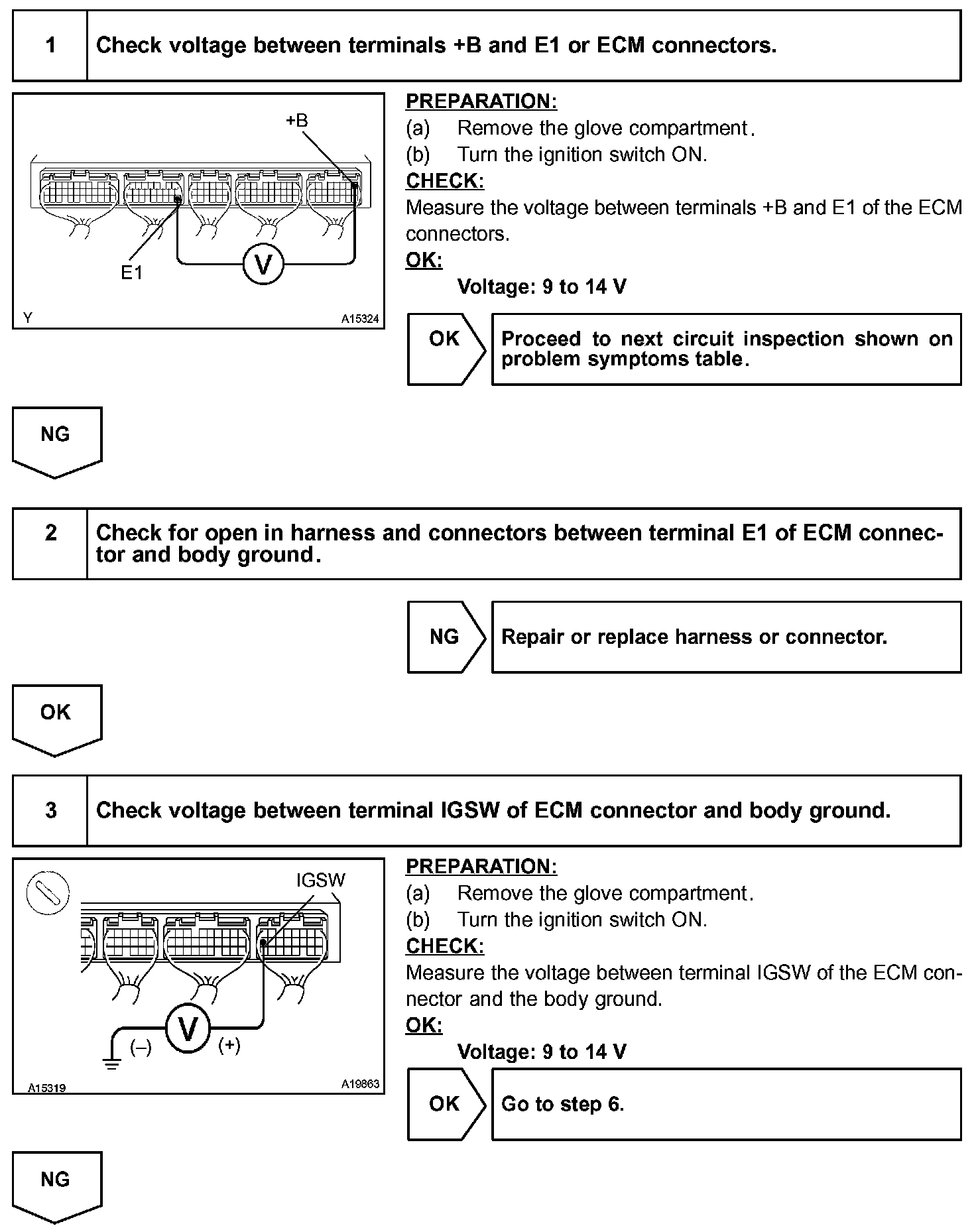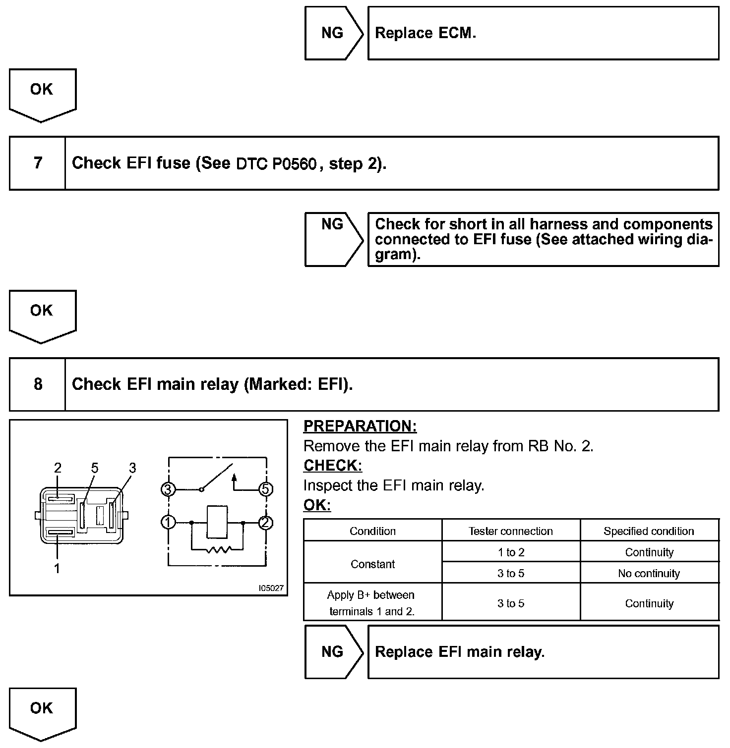 This signal causes current to flow to the coil, closing the contacts of the EFI main relay and supplying power to terminal +B of the ECM.