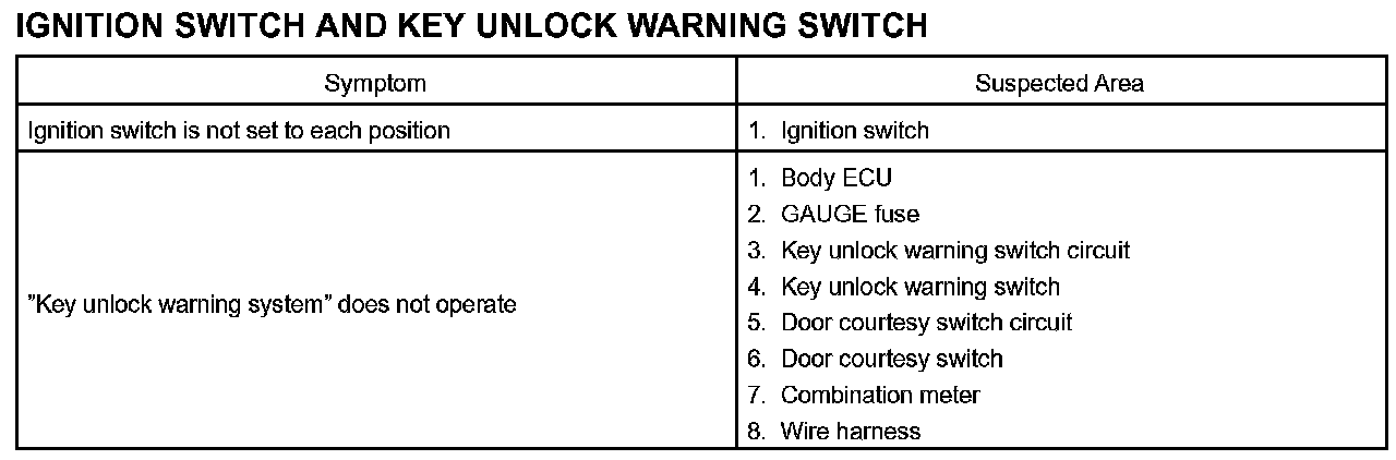 PROBLEM SYMPTOMS TABLEProblem Symptoms Table - Ignition Switch And Key Unlock Warning Switch: