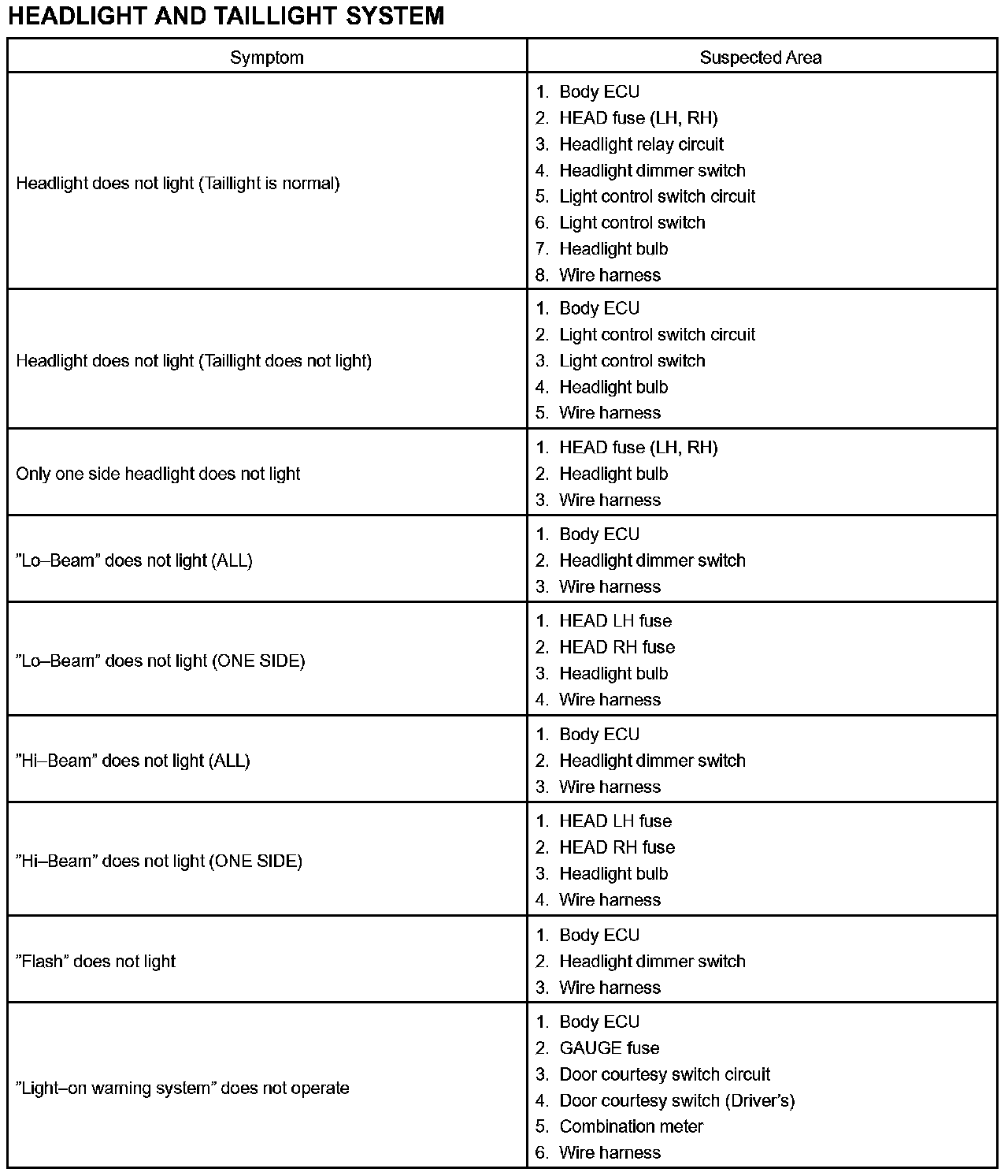 Problem Symptoms Table - Headlight And Taillight System Part 2: