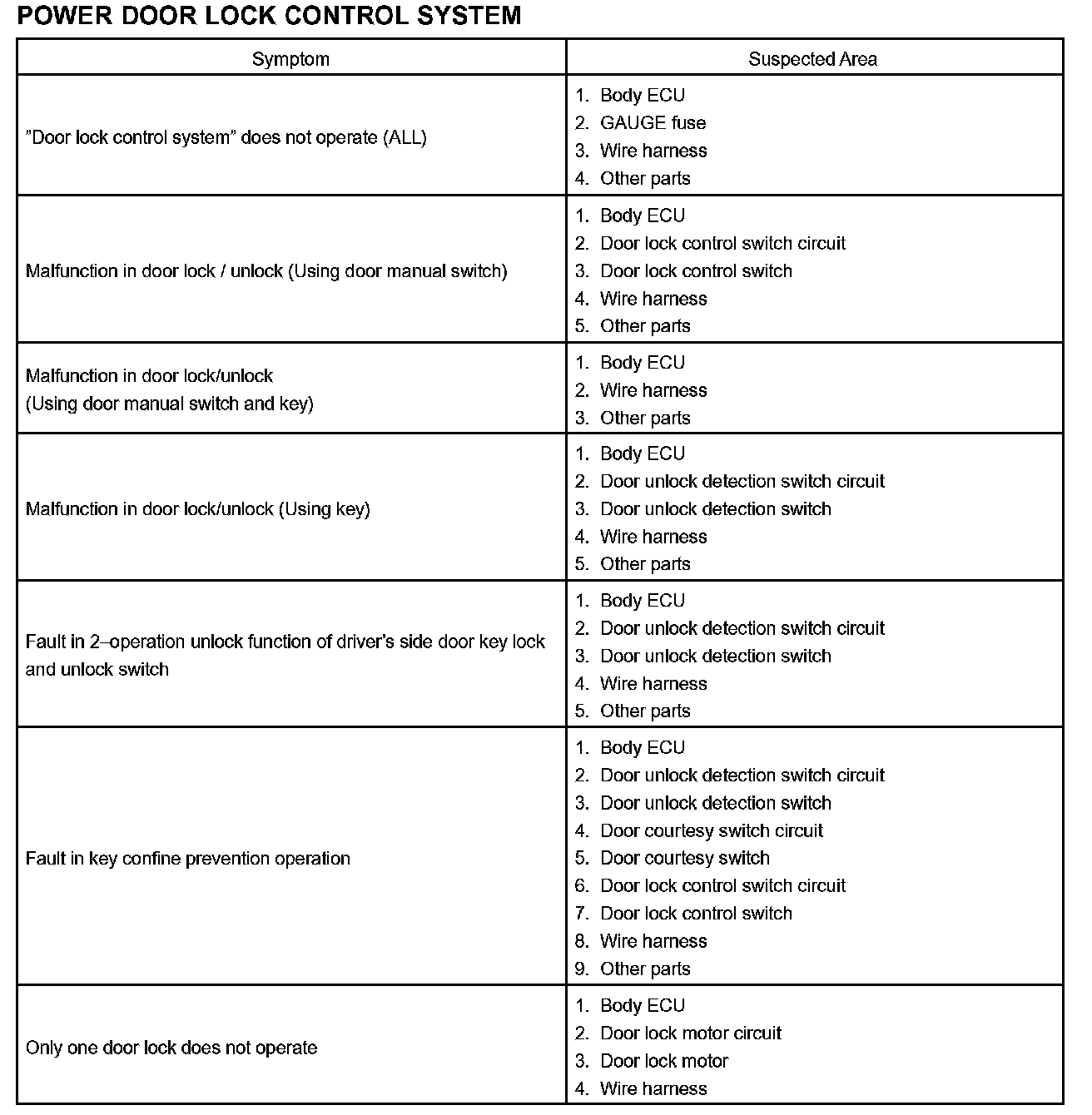 Problem Symptoms Table - Power Door Lock Control System: