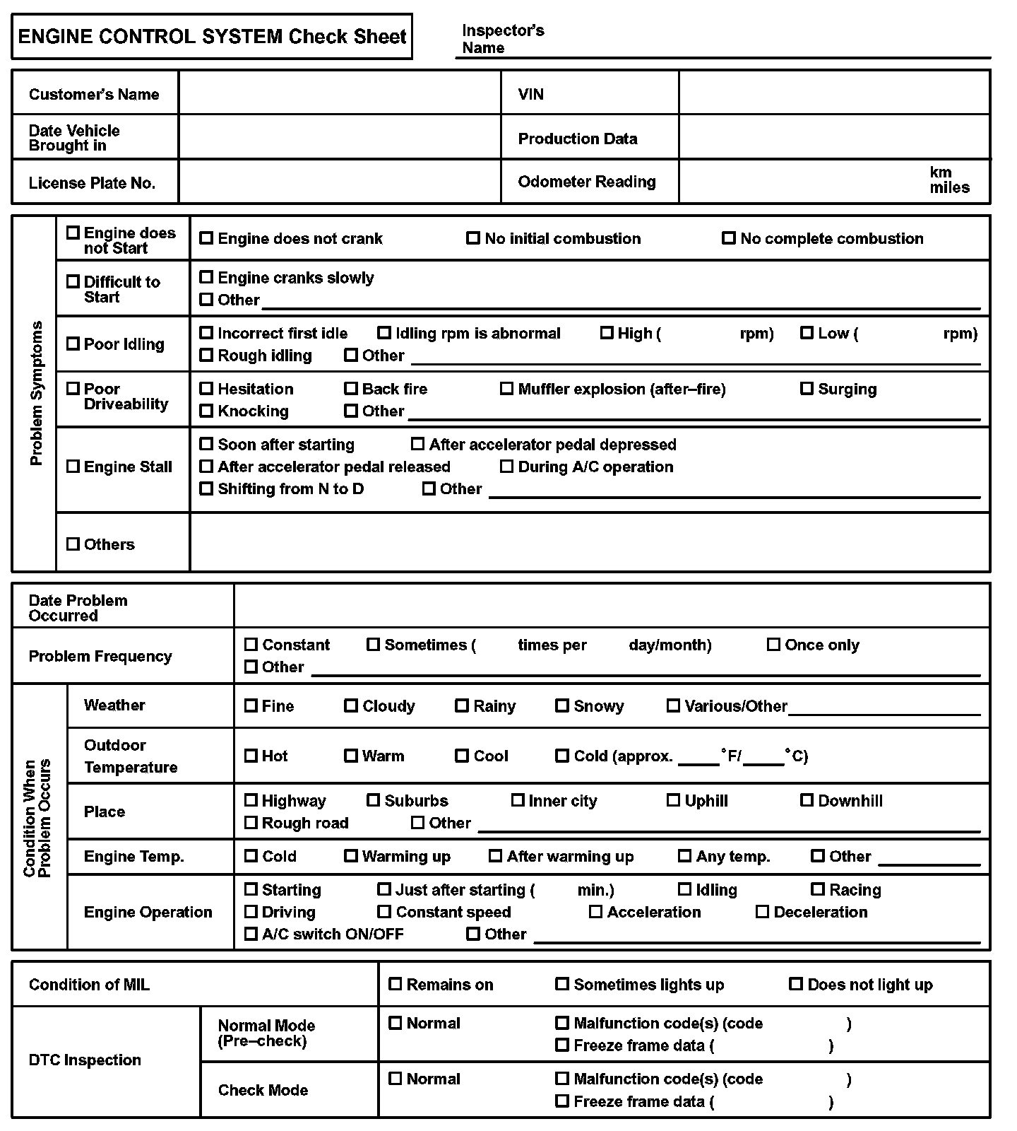Engine Control System Check Sheet: