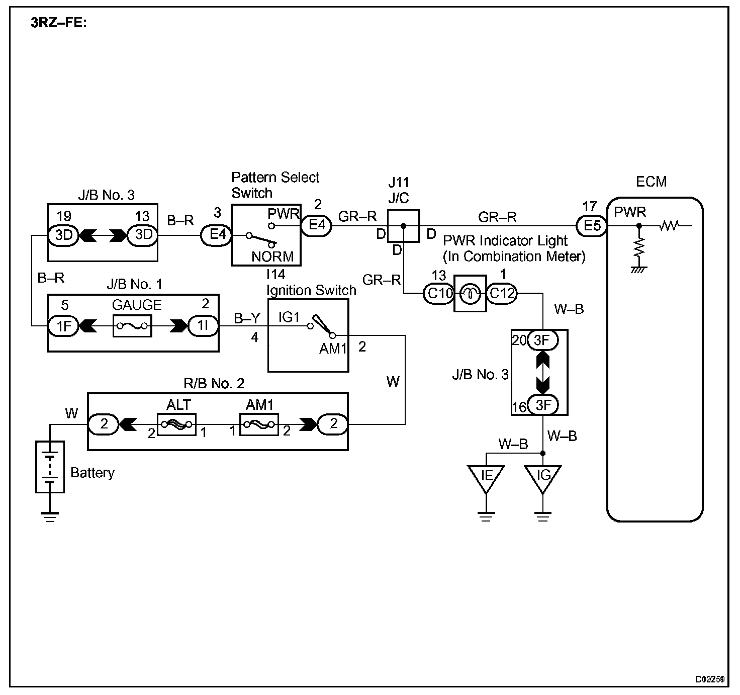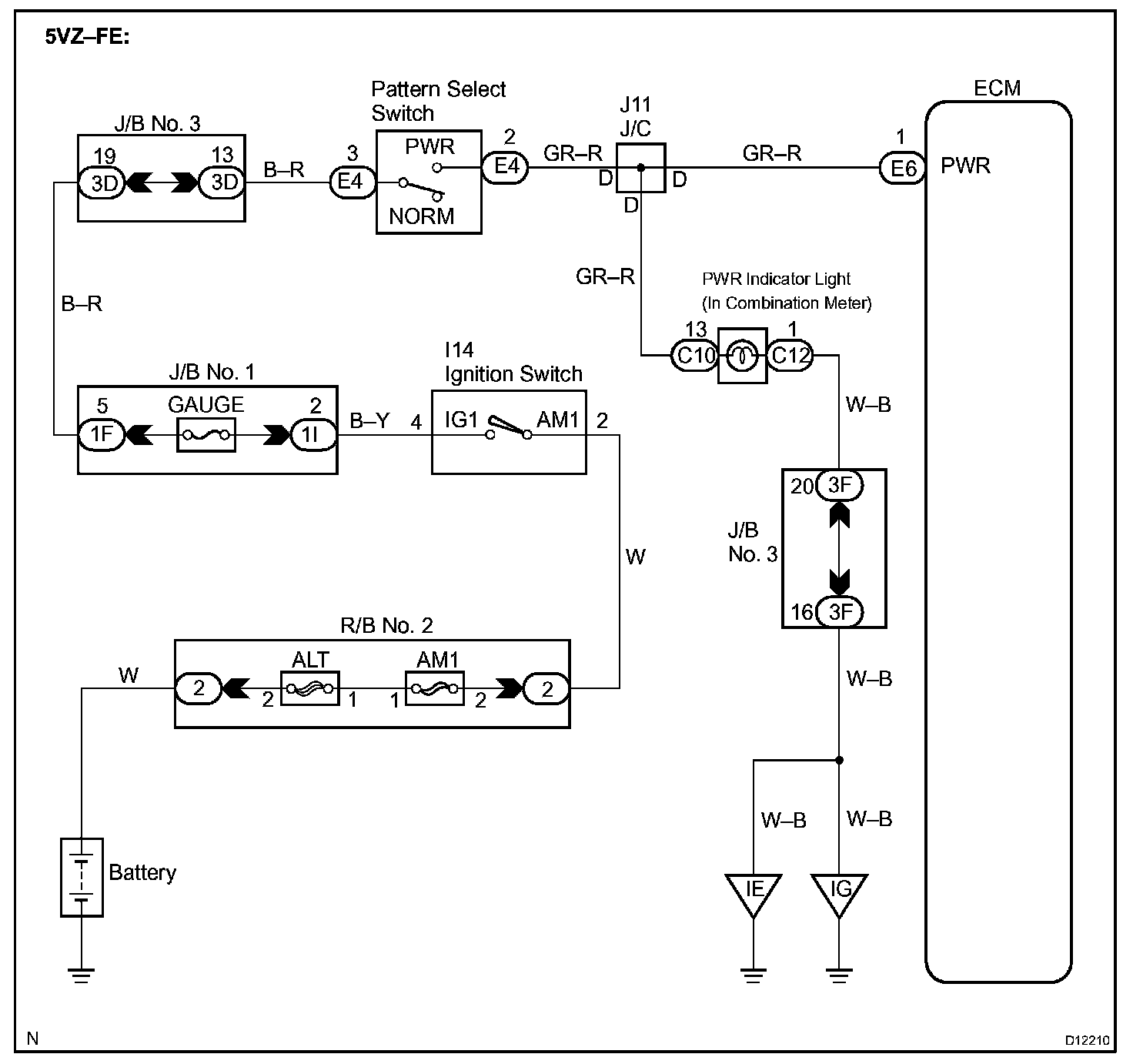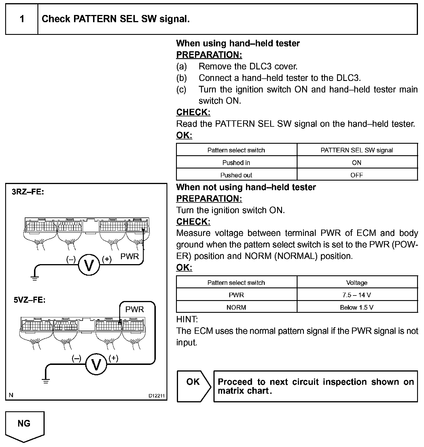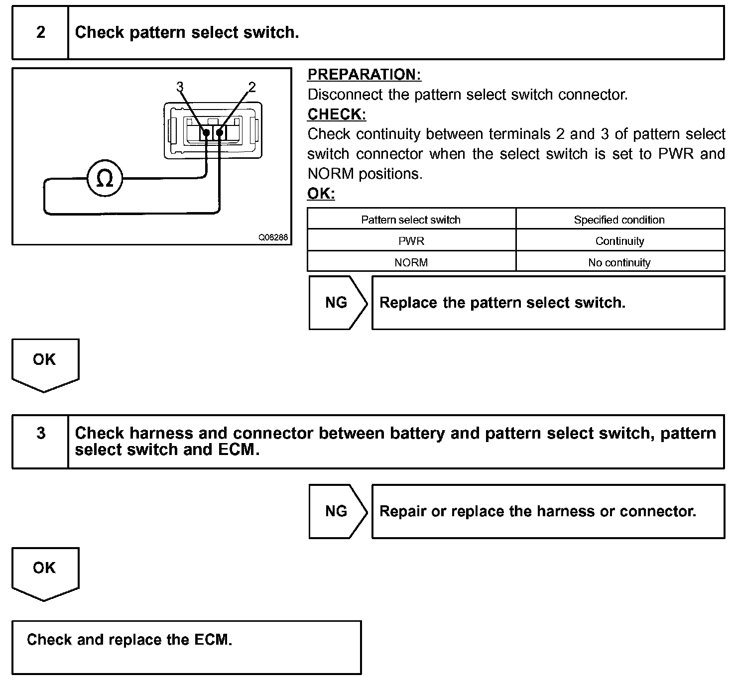 The ECM memory contains the shift programs for the NORMAL and POWER patterns, 2 position, L position and the lock-up patterns. Following the programs corresponding to the signals from the pattern select switch, the park/neutral position and other various sensors, the ECM switches the solenoid valves ON and OFF, and controls the transmission gear change and the lock-up clutch operation.
