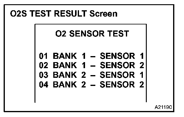b. On the tester screen, select the following menus: DIAGNOSIS / CARB OBD II / O2S TEST RESULT. A list of the O2S equipped on the vehicle will be displayed.